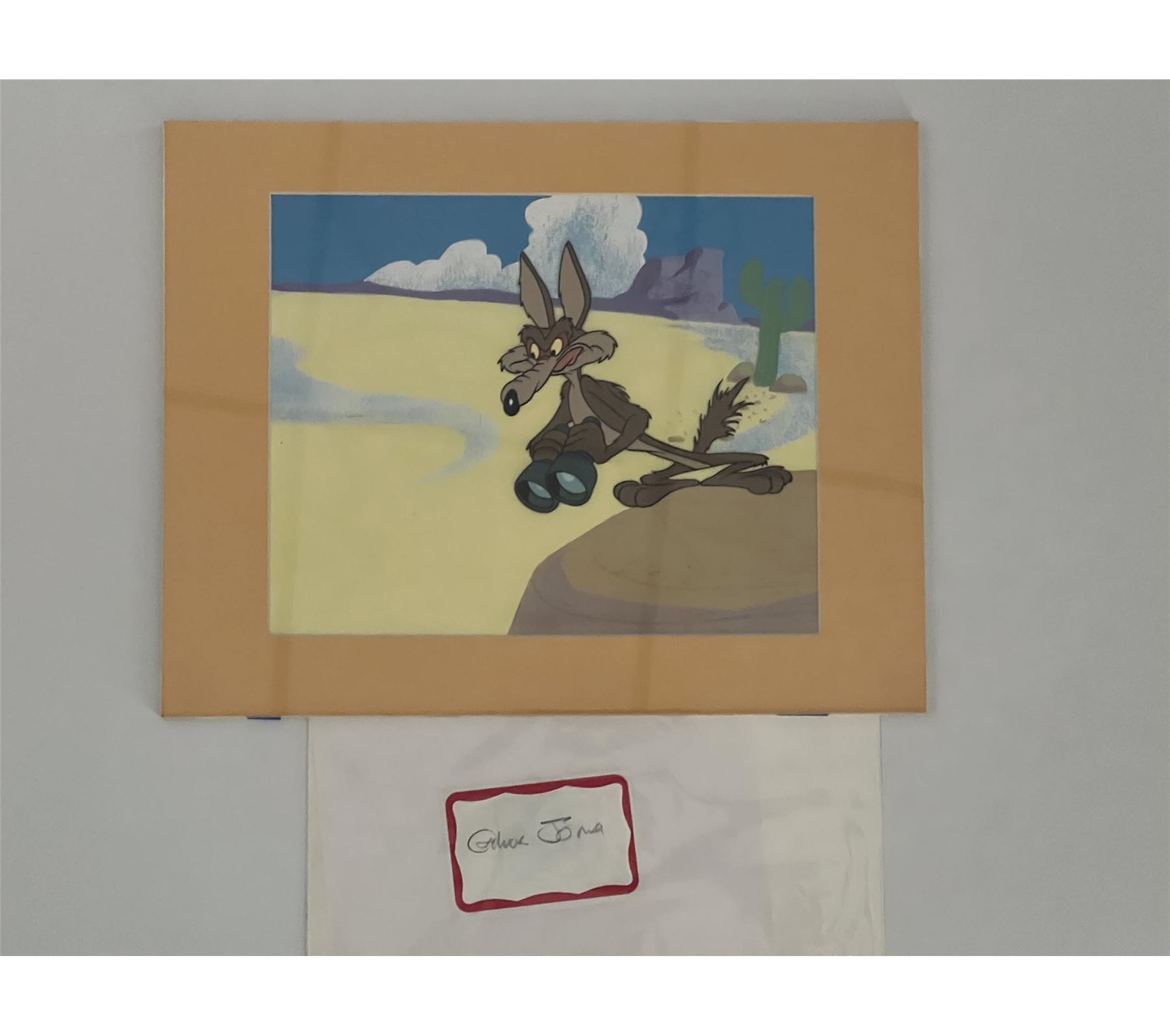 Wile E. Coyote Warner Brothers original animation cel on desert landscape matted under plexiglass. Chuck Jones signature card on back. 11x14 inches
