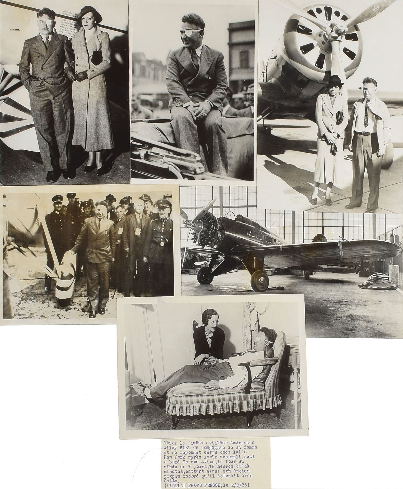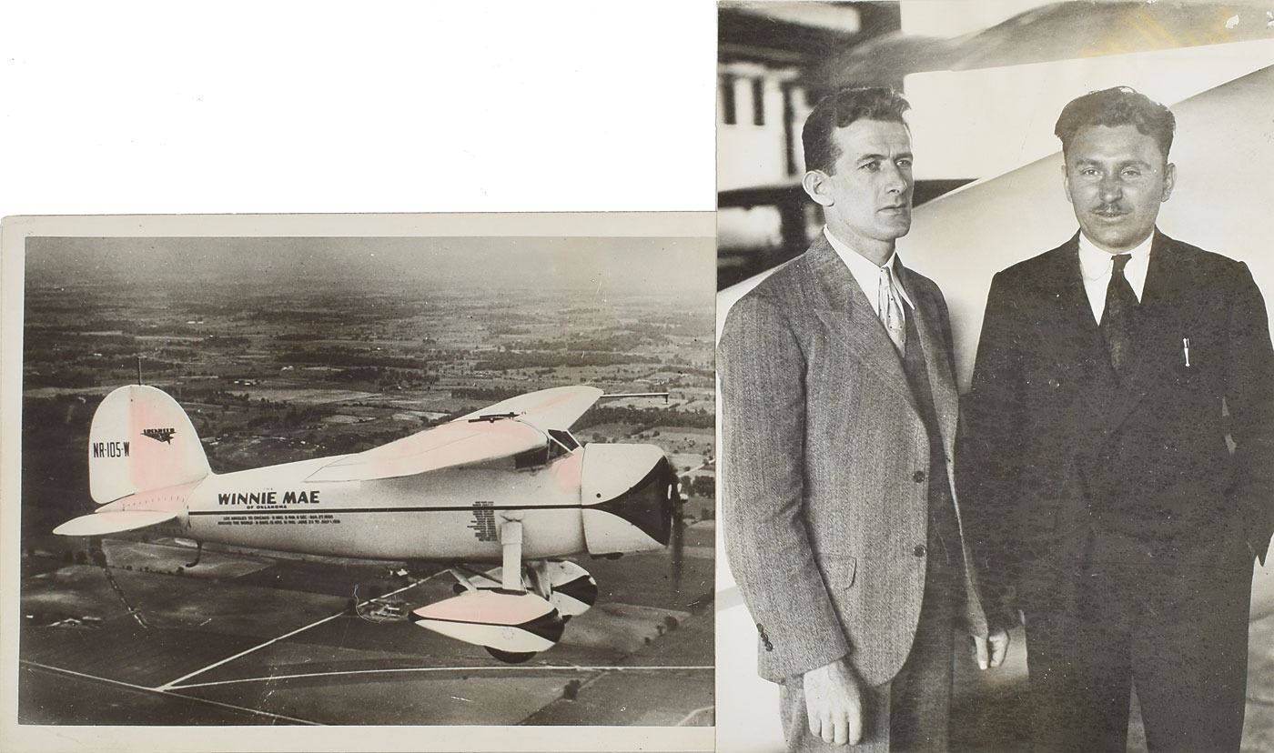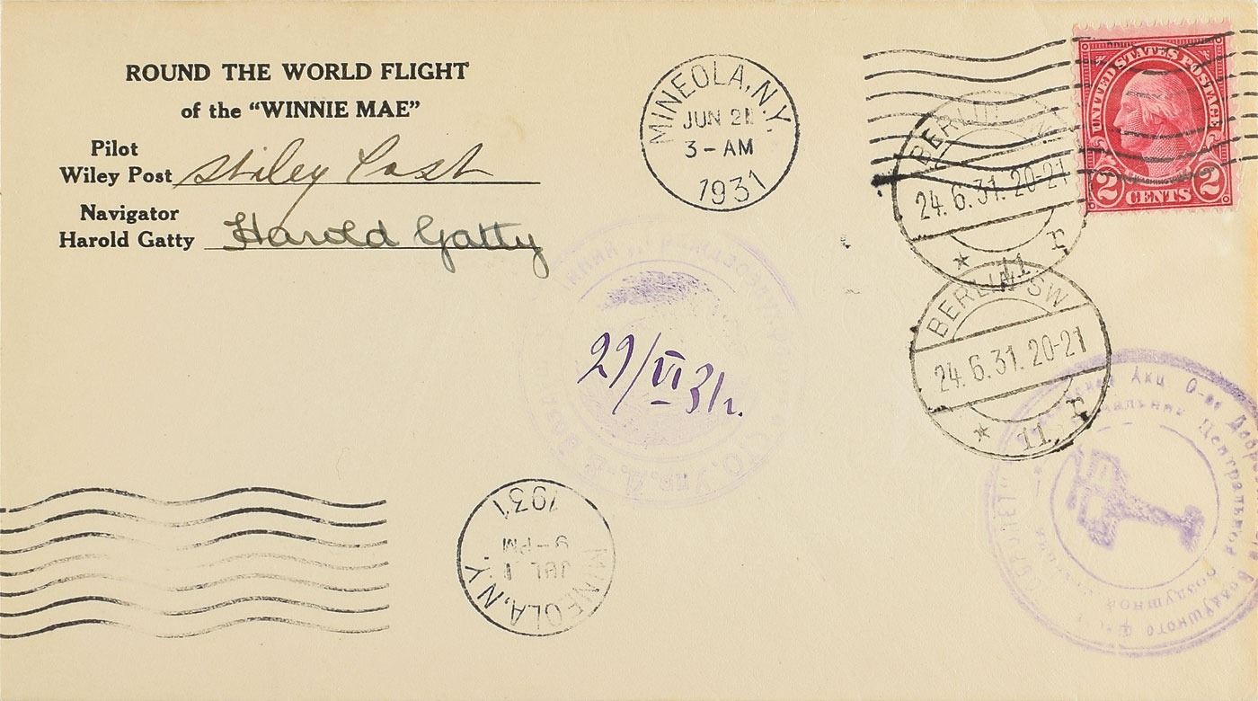 Pilot Wiley Post (1898–1935), accompanied by navigator Harold Gatty (1903–1957), set the speed record for around-the-world flight during a trip aboard the Winnie Mae completed on July 1, 1931. Post later became the first pilot to circle the globe solo. He died, along with humorist Will Rogers, when a plane he was piloting crashed during takeoff from a lagoon near Point Barrow, Alaska. Desirable flown airmail cover carried on the record-breaking "Round the World Flight of the 'Winnie Mae'" in 1931, bearing six postal cancellations, signed in the upper left corner by Wiley Post as the pilot and Harold Gatty as the navigator. Includes twelve original vintage photographs related to Post, including those of the Winnie Mae, Post and Gatty, and Post in his pressure suit for an altitude record attempt, ranging in size from 5 x 7 to 6.5 x 8.5. In overall very good to fine condition.