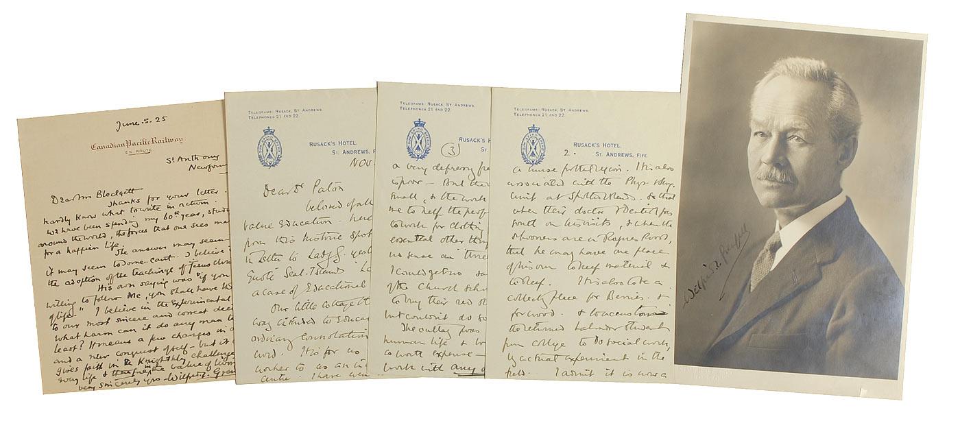 British physician (1865-1940) known for his medical missionary work in Newfoundland and Labrador. Three items: vintage 6 x 9 photo by J. E. Purdy, signed in fountain pen; and two ALSs, one one-page, and one three-page, one dated June 5, 1925. In fine condition, with some scattered light surface marks and silvering to photo, and a uniform shade of toning to one letter.