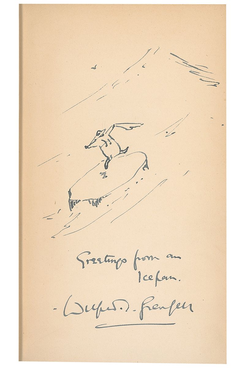 British physician (1865-1940) known for his medical missionary work in Newfoundland and Labrador. Signed book: Adrift on an Ice-Pan. Later printing. Boston: Houghton Mifflin, 1926. Hardcover, 4.5 x 7.5, 69 pages. Grenfell has sketched a man adrift on a block of ice and signed on the first free end page in fountain pen, “Greetings from an ice pan, Wilfred T. Grenfell.” An address label affixed to the front pastedown and some soiling to the covers and spine, otherwise fine condition.