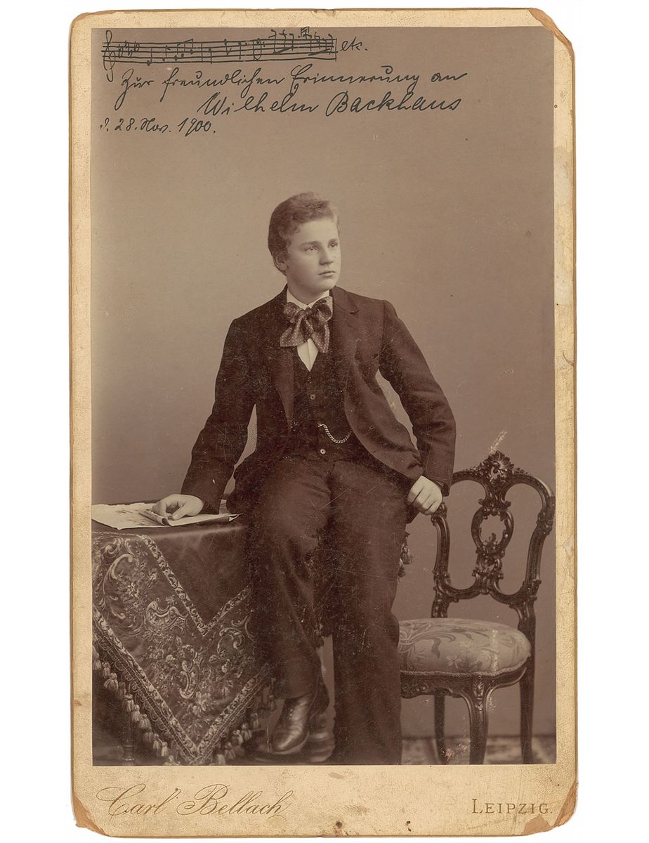 German pianist (1884–1969) known for his interpretations of Beethoven and romantic music such as that by Brahms. Extremely early 5.25 x 8.5 cabinet photo of Backhaus in a full-length pose at age 16, neatly signed and inscribed in German at the top in black ink and dated November 28, 1900, with a three-bar AMQS in A-flat major. Published by Carl Bellach of Leipzig. Chipping and surface impressions to edges, otherwise fine condition. Originates from the collection of American violinist and pianist Louis Persinger (1887–1966), who trained at the Leipzig Conservatory and later taught at Juilliard, mentoring the likes of Yehudi Menuhin, Ruggiero Ricci, and Isaac Stern. Backhaus studied at the Leipzig Conservatory from 1891 to 1899, and launched his first concert tour in 1900, the year he signed this portrait.