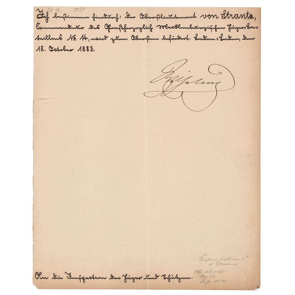Manuscript DS in German, signed “Wilhelm,†one page, 8.75 x 11, October 18, 1883. Untranslated document signed by the German emperor. In fine condition, with a central vertical fold.