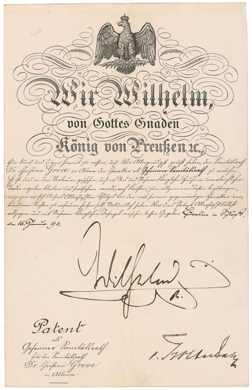 Kaiser of Germany (1859–1941) from 1888 to 1918. Partly-printed DS, in German, signed “Wilhelm R,” one page, 8.25 x 13, February 16, 1911. Untranslated official document concerning a patent. Grandly signed in black ink by Wilhelm. In fine condition, with bisecting folds, one through a single letter of signature, and large embossed seal over beginning of signature.