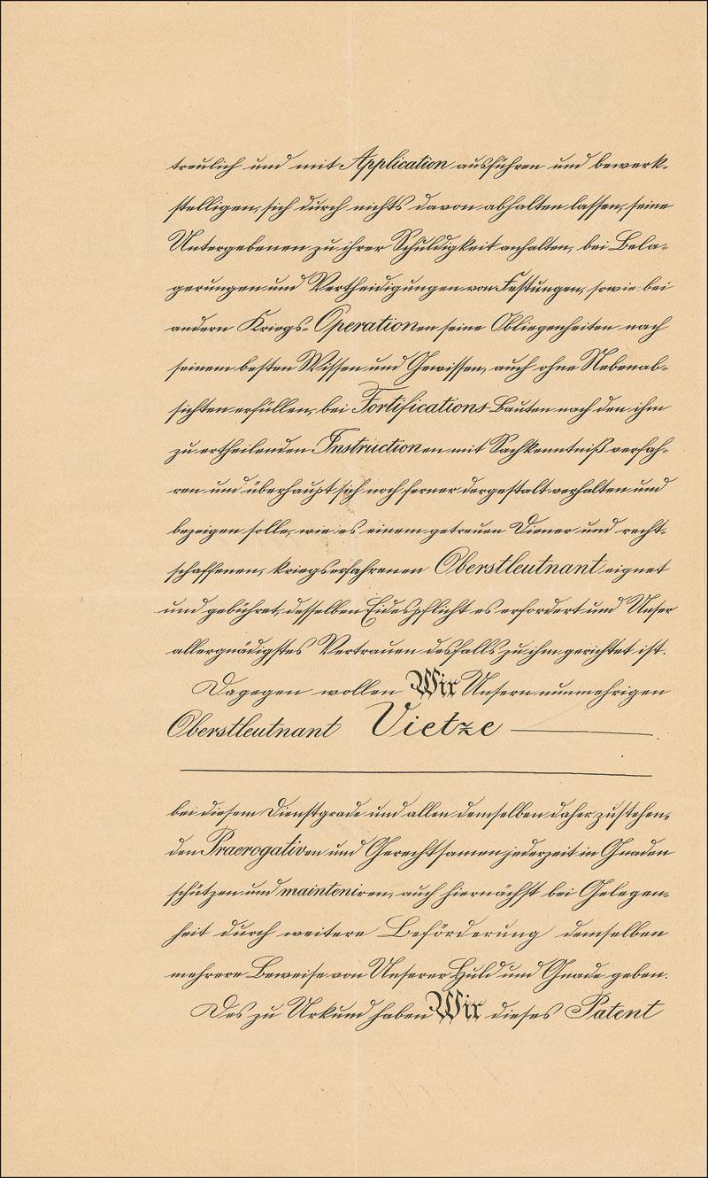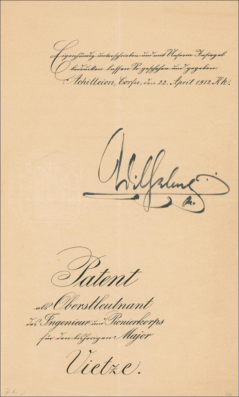 Kaiser of Germany (1859–1941) from 1888 to 1918. Partly-printed DS, in German, three pages on two adjoining sheets, 8.5 x 14.25, April 22, 1912. Untranslated document in which Wilhelm promotes Max Eduard Georg Huber Vietze to the rank of Colonel. Boldly signed on the last page in black ink by Wilhelm. In fine condition, with central vertical fold through first letter of signature, a few light creases, and a uniform shade of mild toning to both pages. The man promoted in this document, Vietze, would eventually become a general officer. Pre-certified PSA/DNA and RRAuction COA.