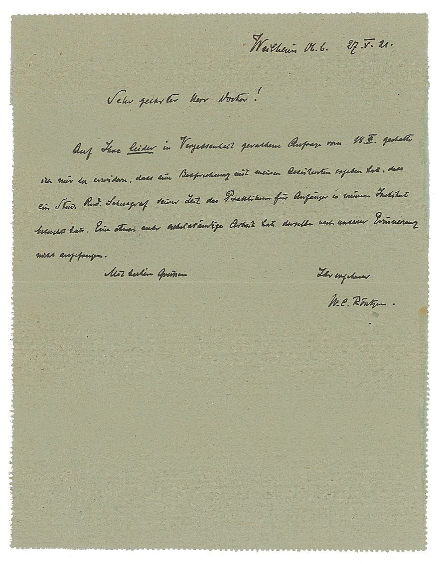 ALS in German, signed “W. C. Rongten,” one page, 5 x 6.5, May 27, 1921. Letter to Dr. H. Stenzel, who had requested a letter of recommendation for Rontgen's former student Rudolf Schuegraf. In his response, Rontgen confirms that Schuegraf had completed an internship at his Institute. Addressed on the reverse by Rontgen to Dr. Stenzl at the pharmaceutical company Boehringer Ingelheim, which remains a global leader in the field. In fine condition.