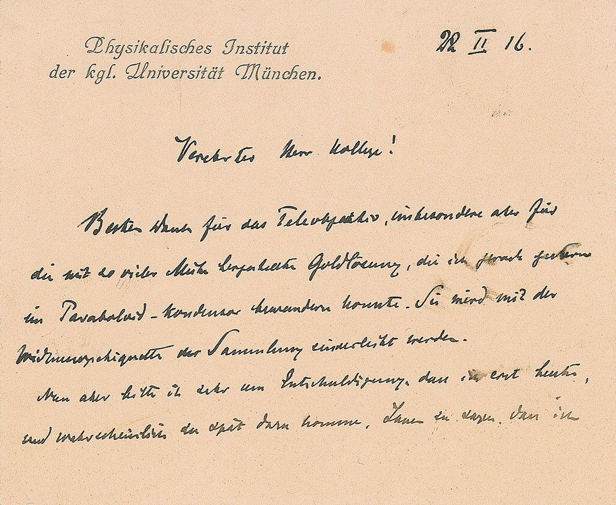 In 1900, just one year before receiving the first Nobel Prize in Physics ‘in recognition of the extraordinary services he has rendered by the discovery of the remarkable rays subsequently named after him,’ Wilhelm Rontgen accepted the Chair of the Physics department at the University of Munich, where he would remain for the next two decades. Despite his international celebrity, he remained a modest and reserved man, continuing his scientific inquiries into a broad area of subjects—from the influence of pressure on the refractive indices of various fluids, to the modification of planes of polarized light by electromagnetic influences, to variations in the functions of temperature and compressibility of water and other fluids. As he always had, Rontgen worked unassisted and built the majority of his apparatuses himself. The passion with which he thanks his colleague for materials and discusses lab equipment—from admiring gold solution “in the paraboloid condenser”(used to condense dark-fields to bring items into focus), to graciously offering “the Institute’s phonic wheel” (for determining the frequency of tuning wheels)—makes this an excellent letter from the Nobel-winning physicist.