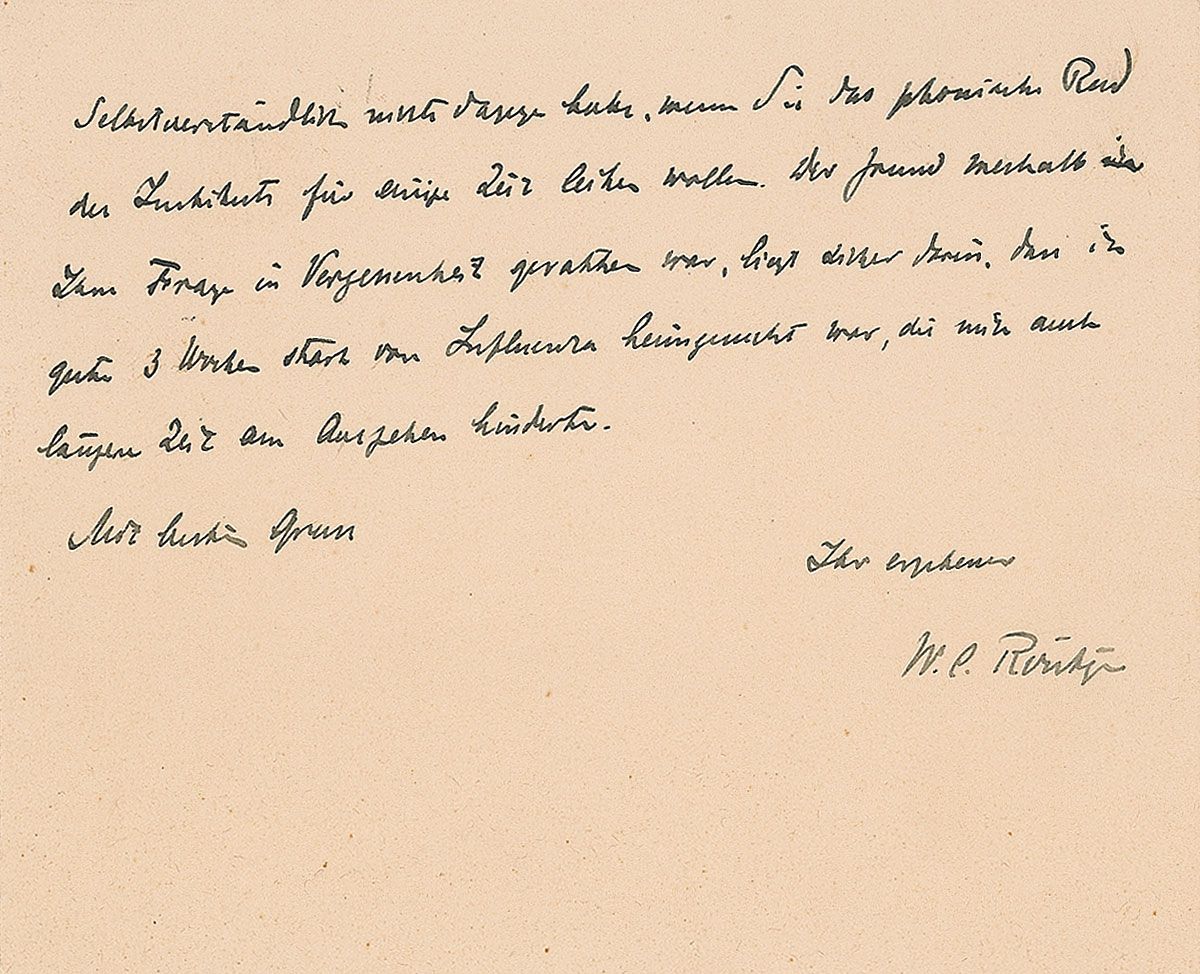 Distinguished German physicist (1845–1923) who discovered X-rays in 1895, for which he was awarded the Nobel Prize in 1901. ALS in German, signed “W. C. Rontgen,” both sides of a 4.25 x 3.5 card, Physics Institute, University of Munich letterhead, February 22, 1916. Letter to a colleague. In full (translated): “Many thanks for the telephoto lens, but especially for the difficult-to-produce gold solution, which I had the chance to admire in the paraboloid condenser just yesterday. It will become a part of the collection along with its dedication label. And now I must beg your forgiveness for only today—and perhaps too late—getting around to informing you that I, of course, have no objection whatsoever if you wish to borrow the Institute’s phonic wheel for a little while. The reason why your request slipped my mind was simply that I have been having a bout of influenza that even kept me from setting foot out of the house for part of the time.” In fine condition.