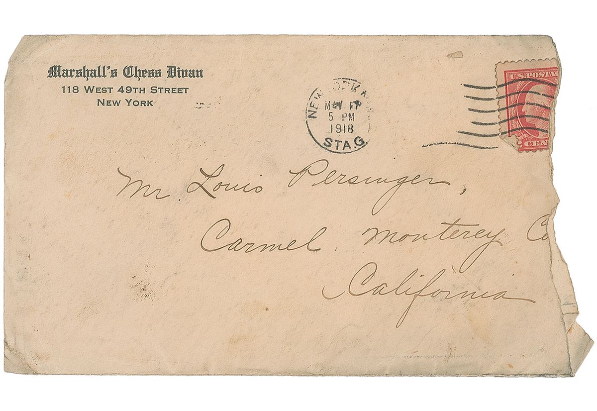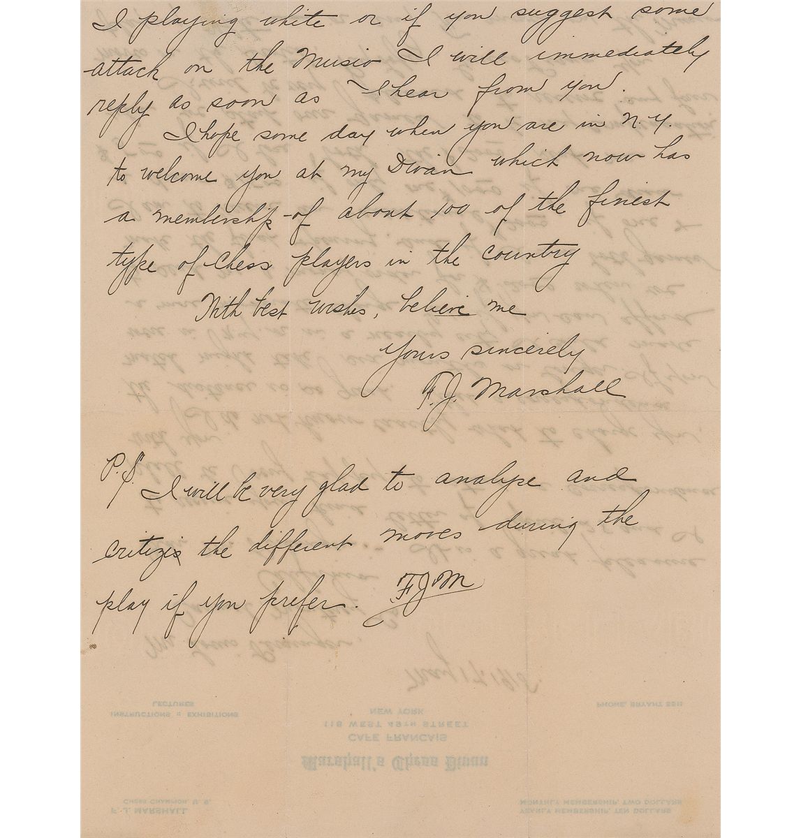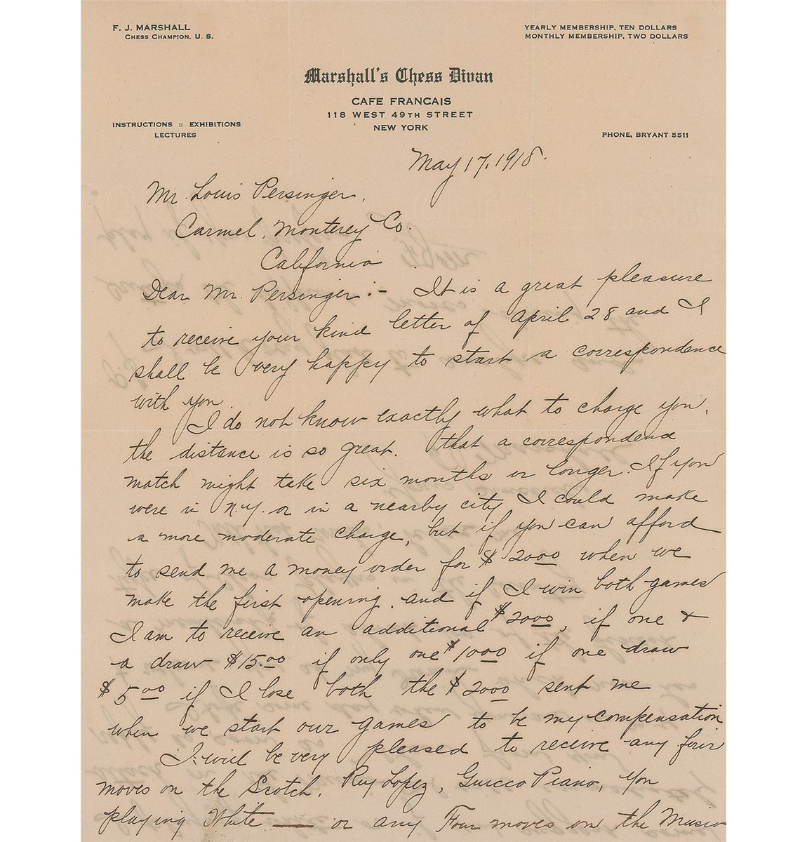 Both chess champions. Steinitz (1836–1900) was the first undisputed world chess champion from 1886 to 1894; Marshall (1877–1944) was the US chess champion from 1909 to 1936. Two ALSs: first is an ALS signed “W. Steinitz,” three pages on two adjoining sheets, June 17, 1894, in part: “There is a suspicion in my mind that the report of…Pollock was willfully distorted in order to make mischief. What happened was this: before we set down to play I had complained to the umpires and to the referee about the Philadelphia incident when Lasker instructed Mr. Kemeny to pull down the blind while it was my turn to play and my time was running. This happened at a critical position and in fact I truly believe it lost me that important game”; and an ALS signed “F. J. Marshall,” one page both sides, May 17, 1918, in part: “The distance is so great that a correspondence match might take six months or longer…If you can afford to send me a money order for $20.00 when we make the first opening, and if I win both games I am to receive an additional $20.00…I will be very glad to analyze and criticize the different moves during the play if you prefer.” In overall fine condition. The Marshall letter is accompanied by the original mailing envelope. Originates from the collection of American violinist and pianist Louis Persinger (1887–1966), who trained at the Leipzig Conservatory and later taught at Juilliard, mentoring the likes of Yehudi Menuhin, Ruggiero Ricci, and Isaac Stern.