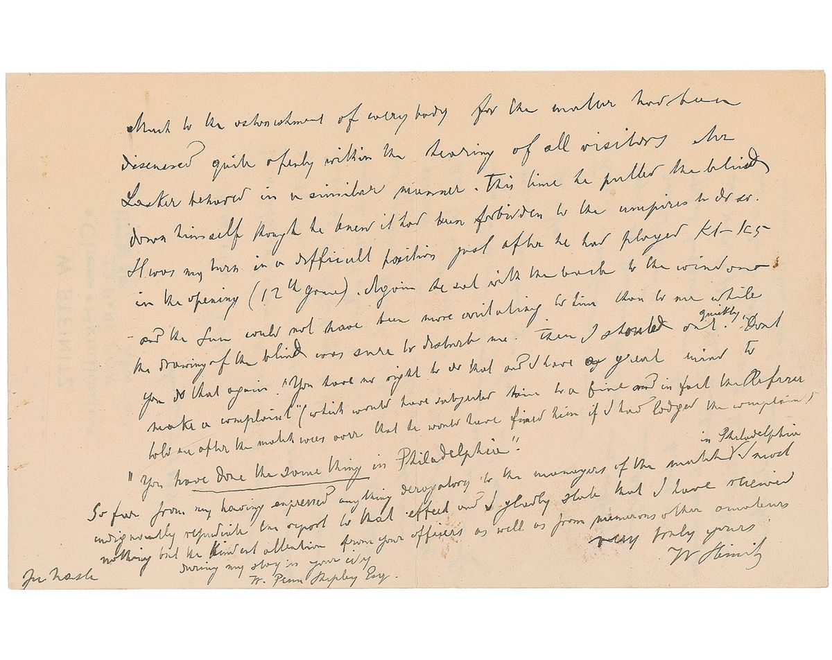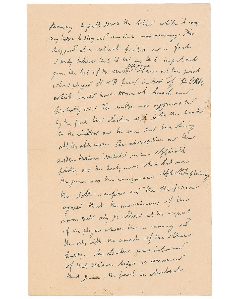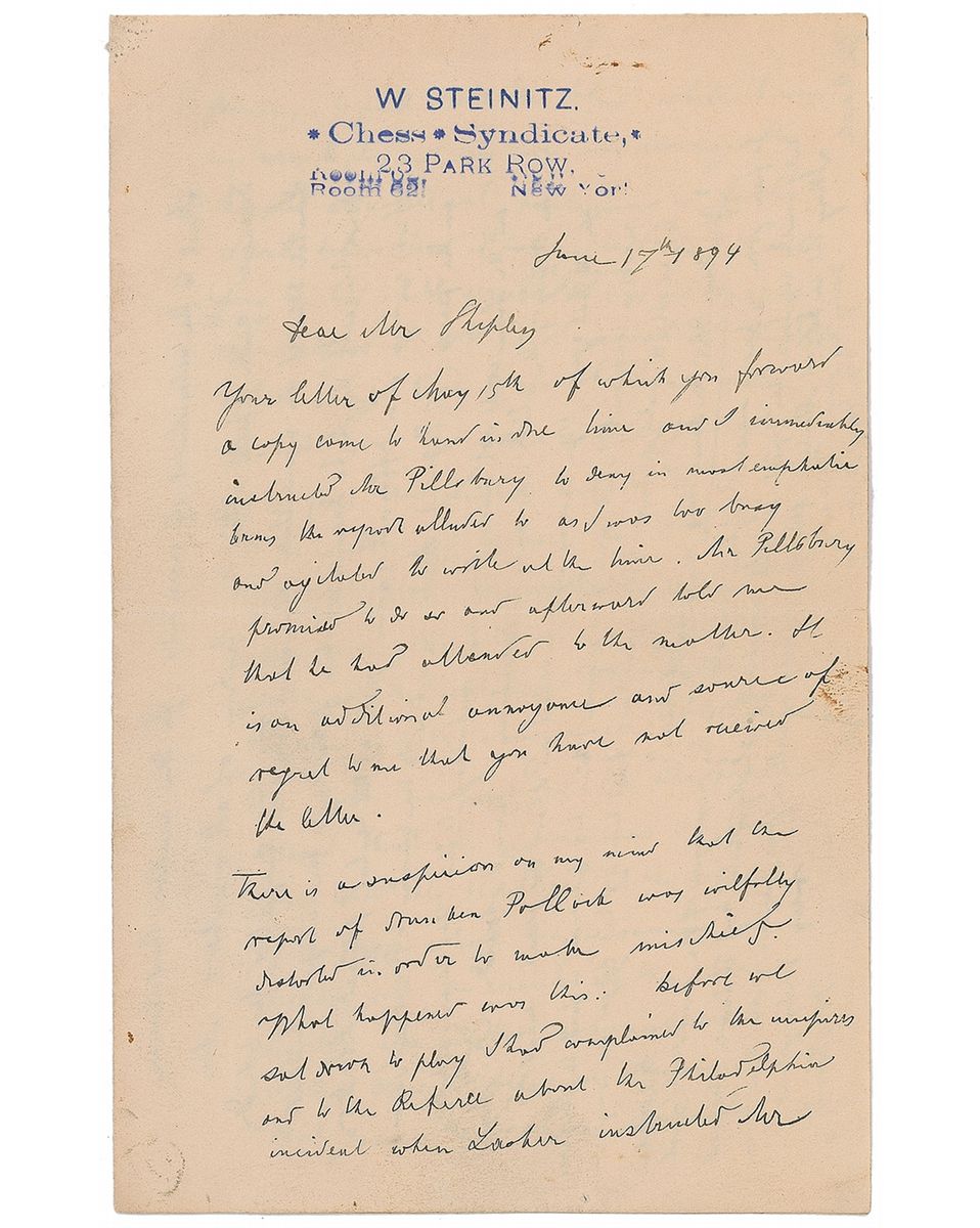 Both chess champions. Steinitz (1836–1900) was the first undisputed world chess champion from 1886 to 1894; Marshall (1877–1944) was the US chess champion from 1909 to 1936. Two ALSs: first is an ALS signed “W. Steinitz,” three pages on two adjoining sheets, June 17, 1894, in part: “There is a suspicion in my mind that the report of…Pollock was willfully distorted in order to make mischief. What happened was this: before we set down to play I had complained to the umpires and to the referee about the Philadelphia incident when Lasker instructed Mr. Kemeny to pull down the blind while it was my turn to play and my time was running. This happened at a critical position and in fact I truly believe it lost me that important game”; and an ALS signed “F. J. Marshall,” one page both sides, May 17, 1918, in part: “The distance is so great that a correspondence match might take six months or longer…If you can afford to send me a money order for $20.00 when we make the first opening, and if I win both games I am to receive an additional $20.00…I will be very glad to analyze and criticize the different moves during the play if you prefer.” In overall fine condition. The Marshall letter is accompanied by the original mailing envelope. Originates from the collection of American violinist and pianist Louis Persinger (1887–1966), who trained at the Leipzig Conservatory and later taught at Juilliard, mentoring the likes of Yehudi Menuhin, Ruggiero Ricci, and Isaac Stern.