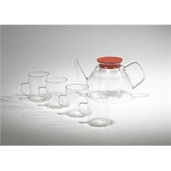 Wilhelm Wagenfeld tea service consisting of teapot, tea retainer and four glasses Schott & Gen Germany, c. 1930s glass, plastic 10"w x 6.5"d x 5.5"h Each piece acid-stamped with factory mark.