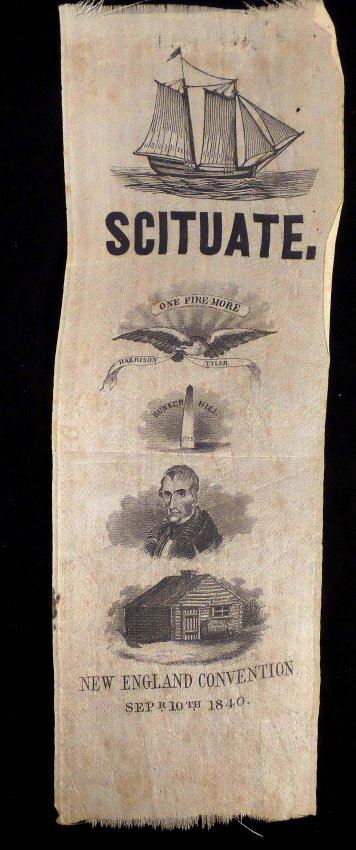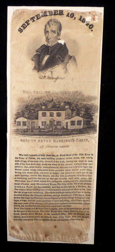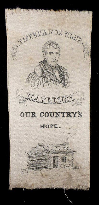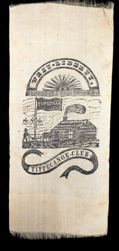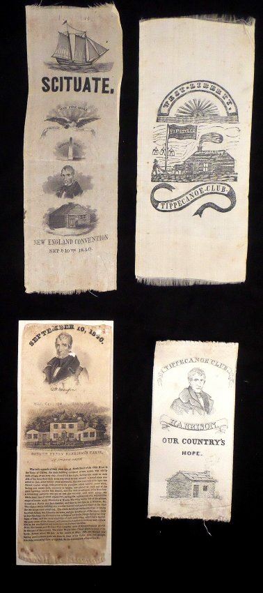 Four antique printed silk campaign ribbons. Comprises: 1.) "Tippecanoe Club" featuring a portrait of Harrison above the slogan "Our Countries Hope". Bears a log cabin at bottom. 2.) "September 10 1840" with a portrait of Harrison and a view of his expanded cabin at North Bend. Bears two paragraphs of densely composed text at bottom. 3.) "Scituate" features five printed vignettes depicting a schooner, federal eagle, obelisk, Harrison's portrait, and a log cabin. 4). Woodcut print for "West Liberty" depicting a log cabin with flag reading "Tip&Tyler" and "Tippecanoe-Club" below. [Smallest: 2-3/4" W x 5-5/8" H; Largest: 3-1/2" W x 7-3/4" H]. Condition varies widely, all sold together as is. Defects include toning, thread bare edges at top and bottom, foxing, and few holes.