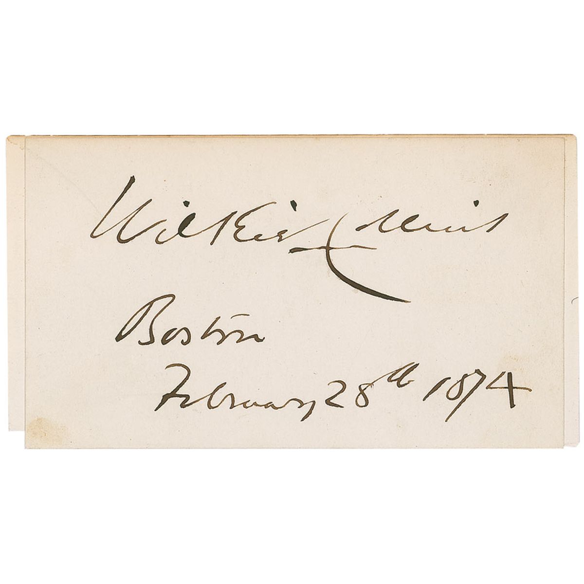 British author regarded as the first British detective story writer (1824–1889). Bold and florid vintage ink signature, “Wilkie Collins, Boston, February 28th, 1874,” on an off-white 4.5 x 2.5 card affixed to a slightly larger slip. In fine condition, with light creasing and toning.