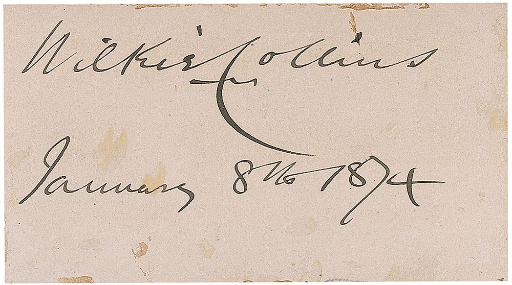 British author regarded as the first British detective story writer (1824–1889). Ink signature, “Wilkie Collins, January 8th, 1874,” on an off-white 3.5 x 2 card. In very good condition, with scattered soiling and adhesive remnants. Accompanied by an unsigned original flyer advertising a performance of Collins’s first play, Lighthouse, in 1857.
