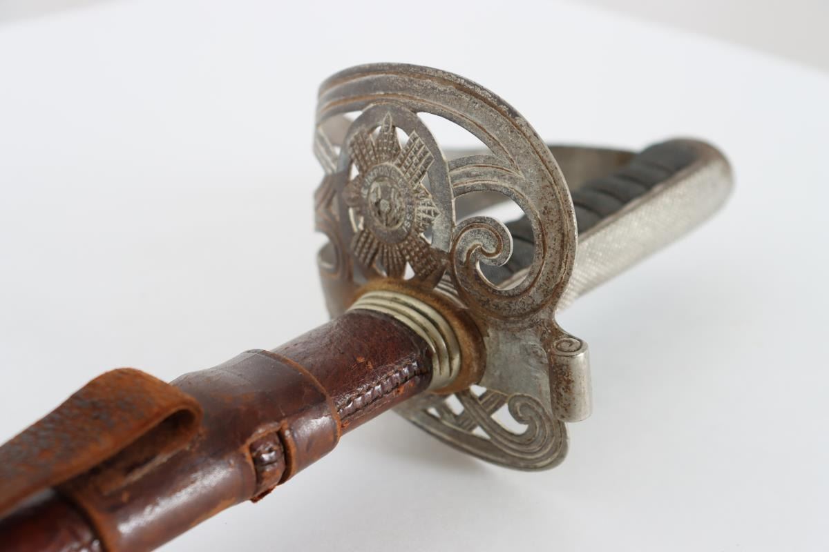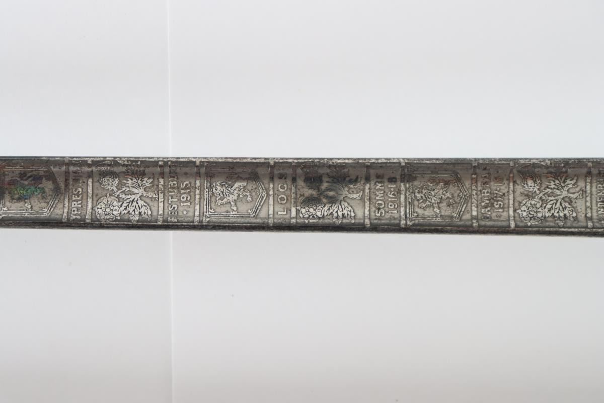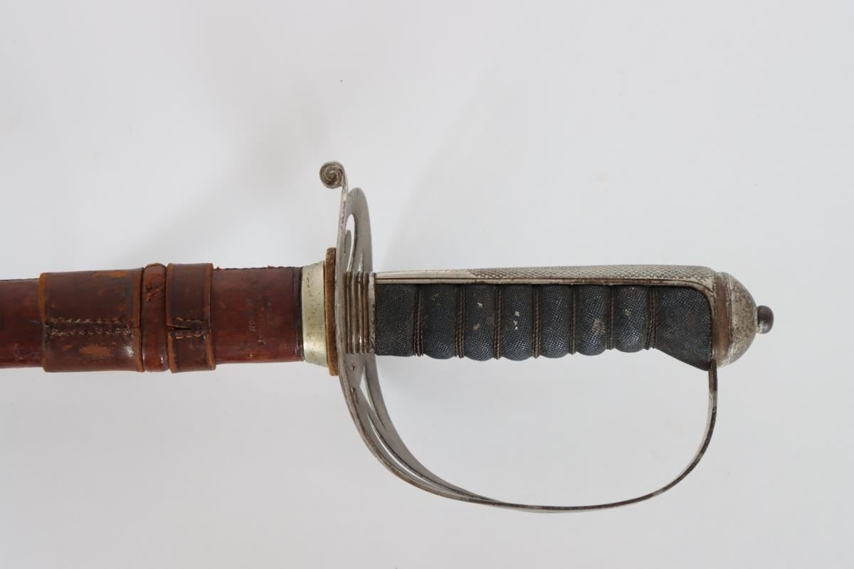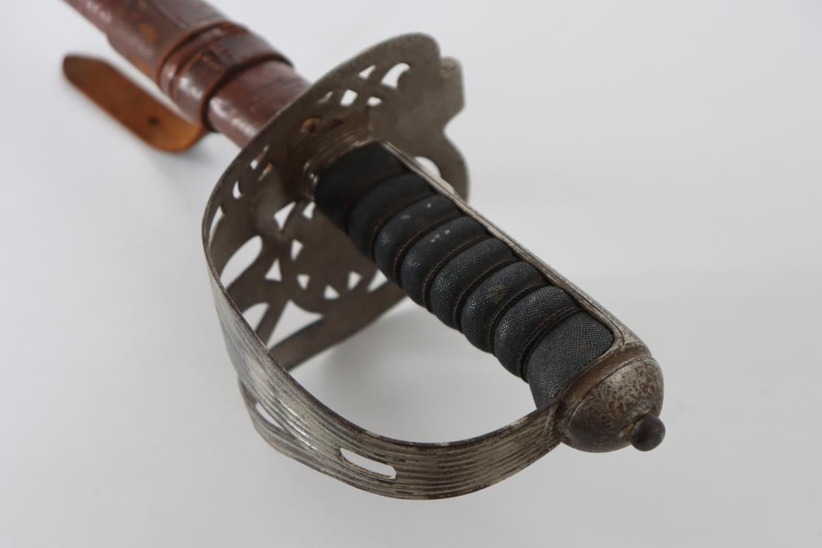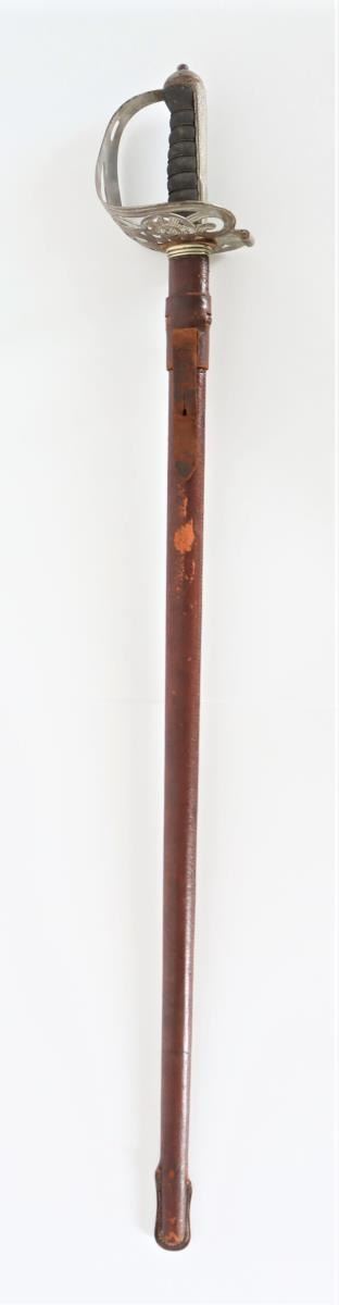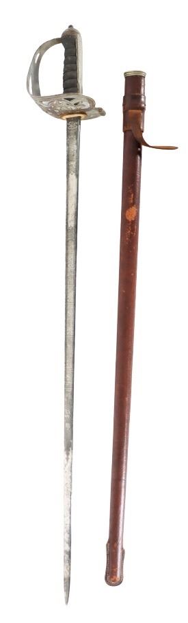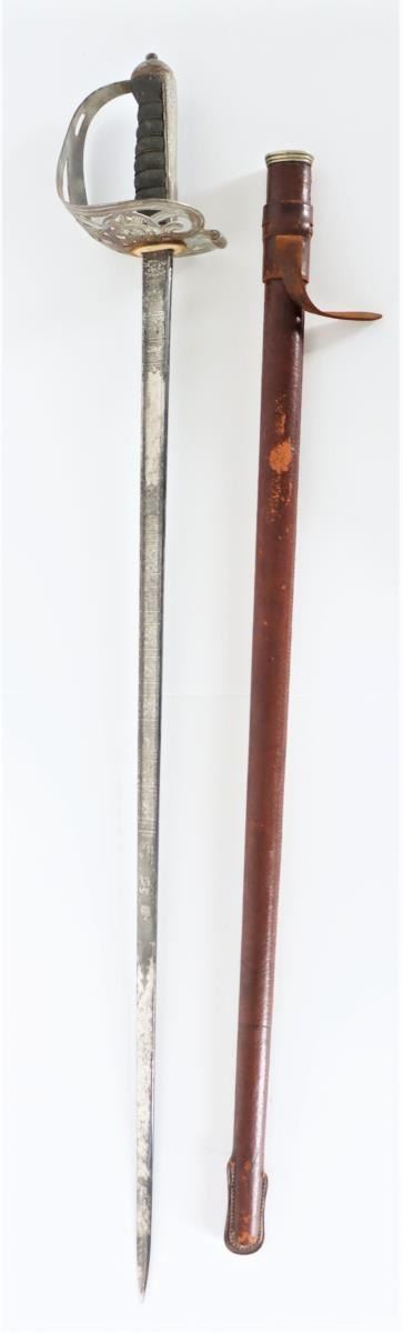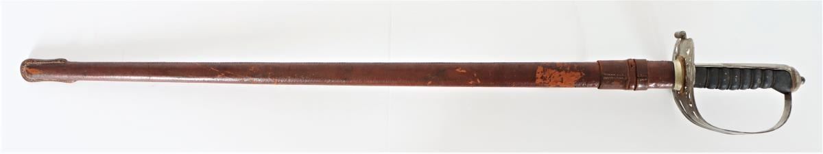 Wilkinson 1914 officer's sword with leather scabbard. Blade is marked with various battle names on both sides.