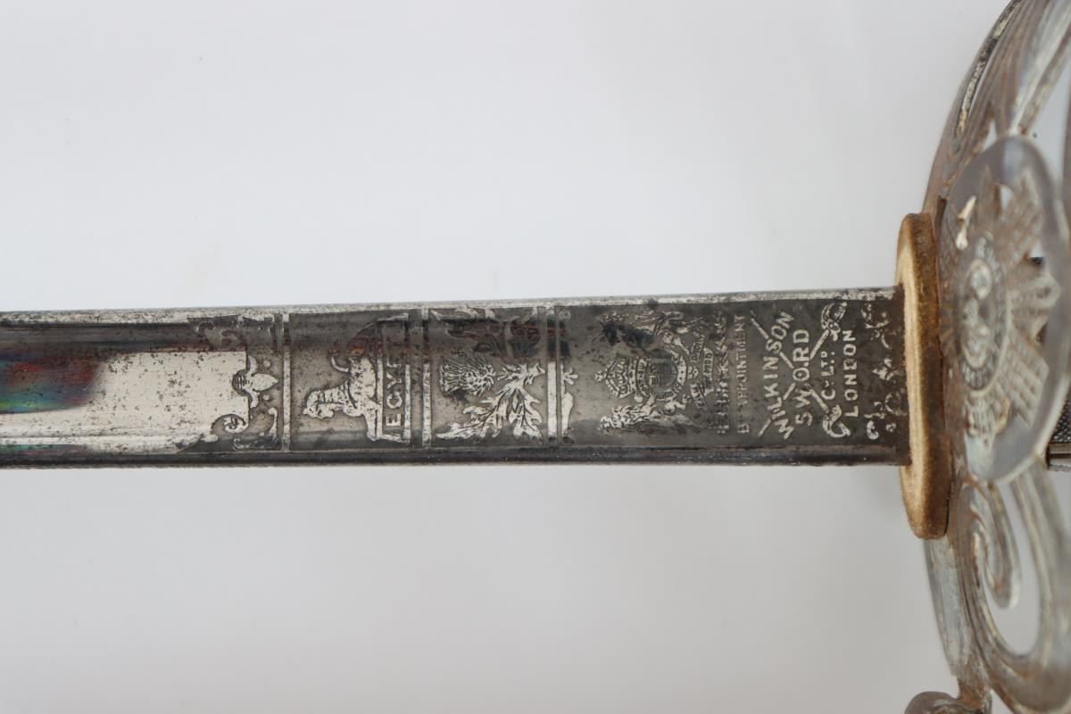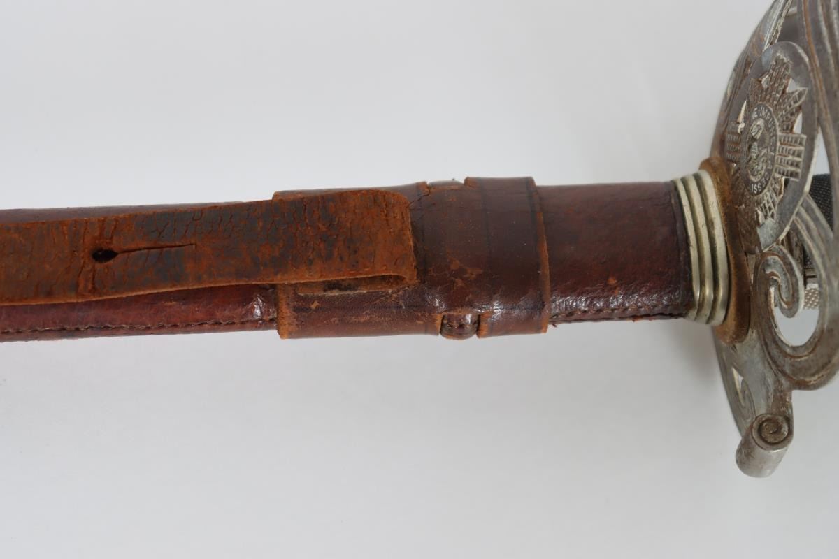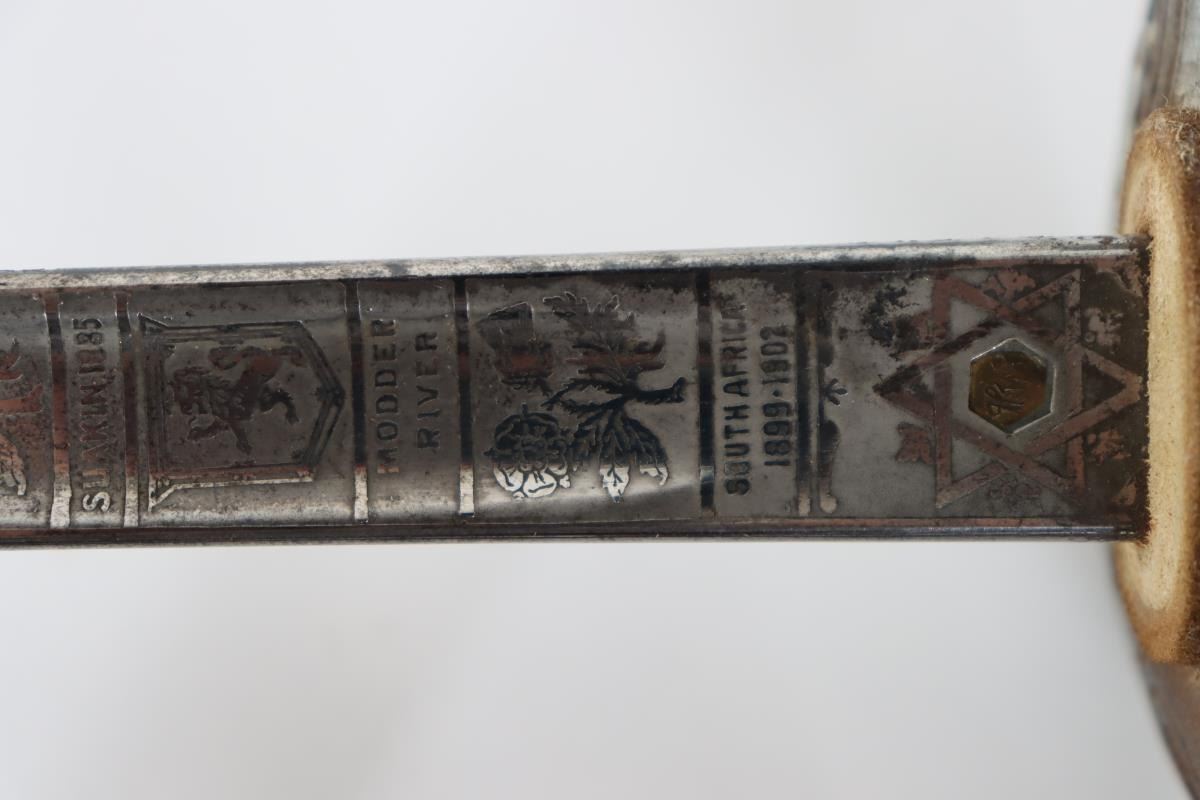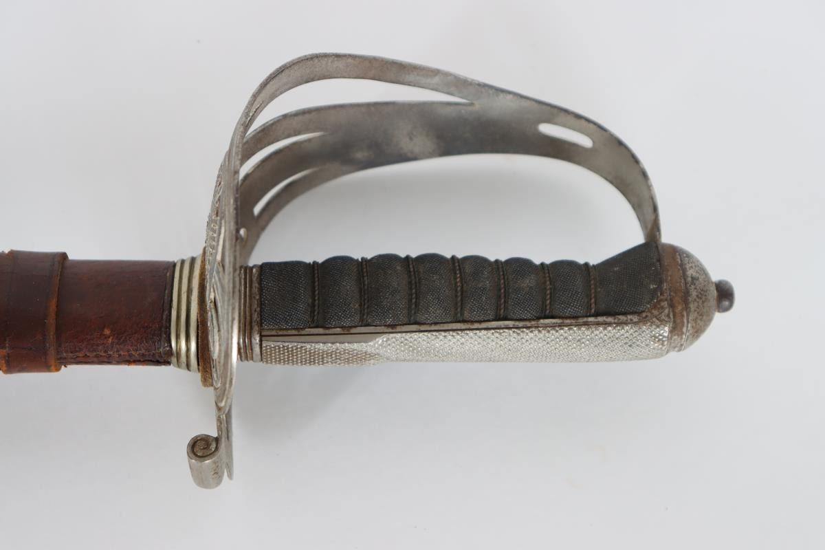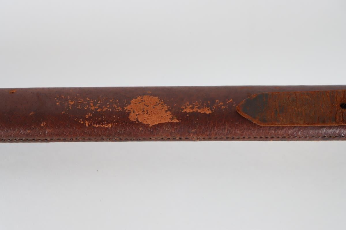 Wilkinson 1914 officer's sword with leather scabbard. Blade is marked with various battle names on both sides.