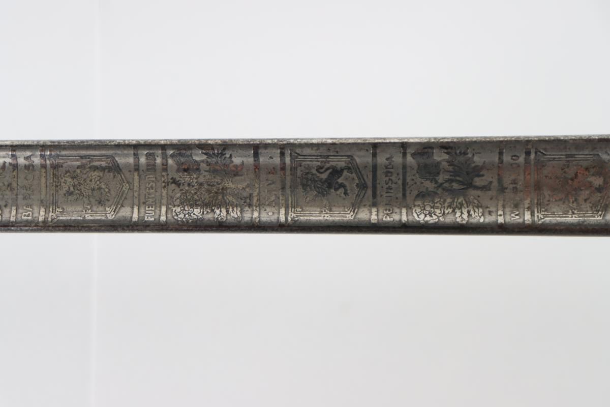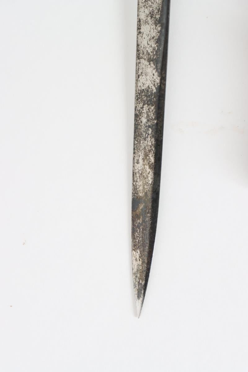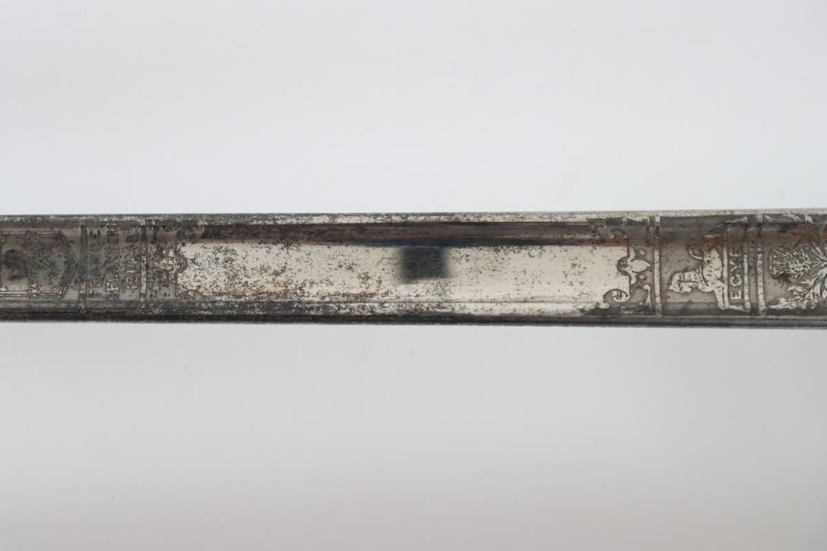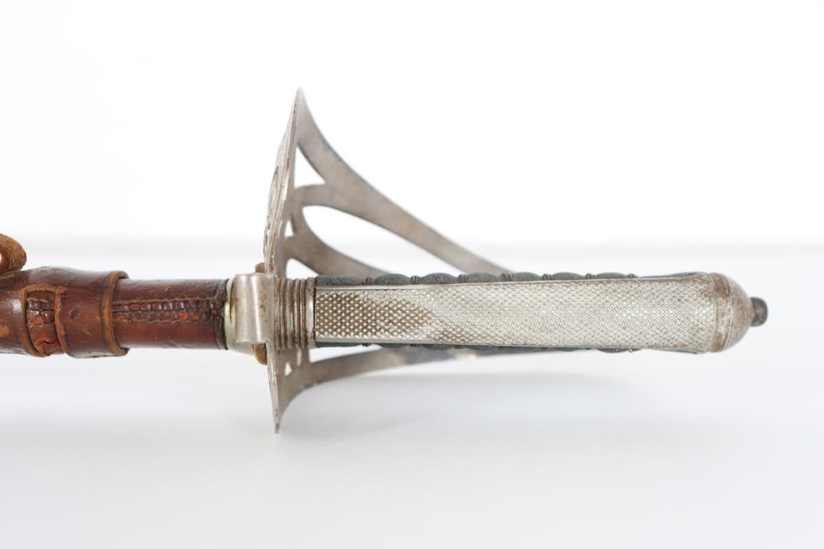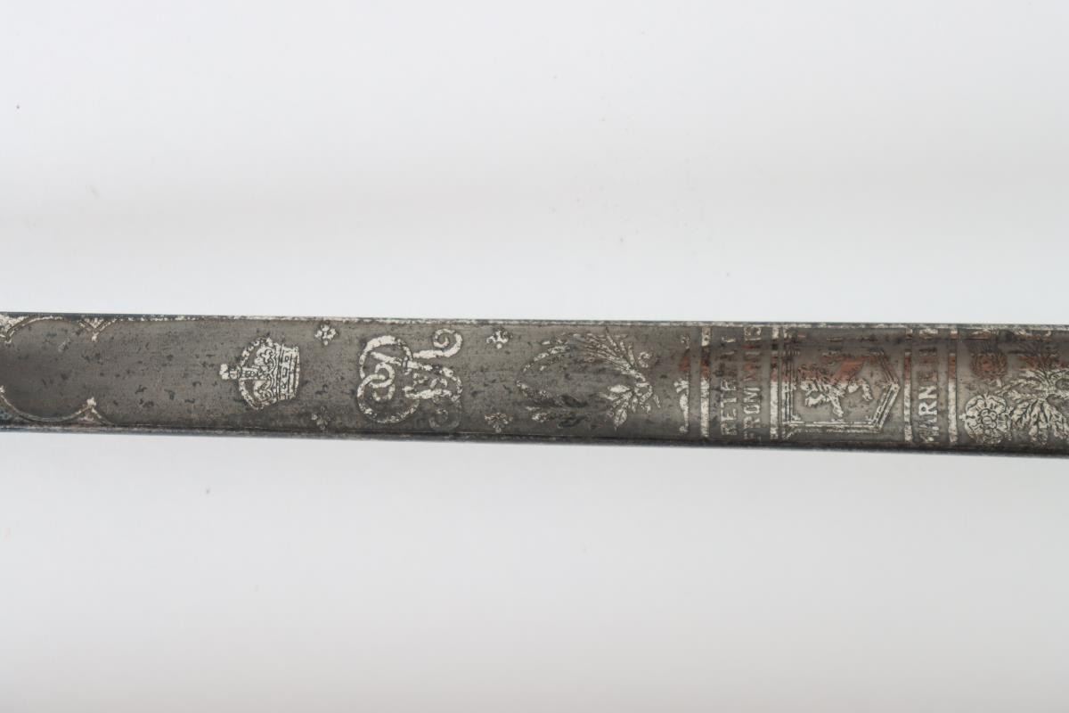 Wilkinson 1914 officer's sword with leather scabbard. Blade is marked with various battle names on both sides.
