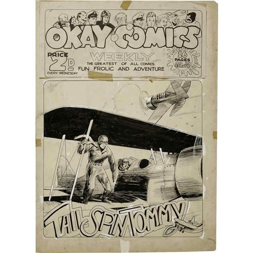 <B>Will Eisner - Okay Comics Tommy Tailspin Cover Original Art (1937).</B></I> Hal Forrest's aviator hero Tommy Tailspin barnstorms out of his newspaper strip to star on this sensational Golden Age comic book cover by Will Eisner. Eisner's early comic book career was outlined by Jim Amash in <B>Alter Ego</B></I> #48: "In 1936, Eisner found brief employment at Henle Publications, an early comic book publisher, creating the 'Harry Karry' and 'The Flame' features for <B>Wow, What a Magazine</B></I>. Along with the ambitious Jerry Iger, a cartoonist better suited for salesmanship, Eisner became the co-owner of the Eisner and Iger Studio, perhaps the first shop to package features for comic books and newspapers." Thus, a collector would be hard-pressed to find an earlier Eisner cover than his <B>Okay Comics</B></I> covers! Will Eisner later signed this cover in blue ballpoint pen at the upper left of the image. The image area of the piece is 15" x 21.5". Aside from the board, which shows slight signs of aging, and some old pieces of cellophane tape which were used to affix the logo, the art is in Excellent condition.