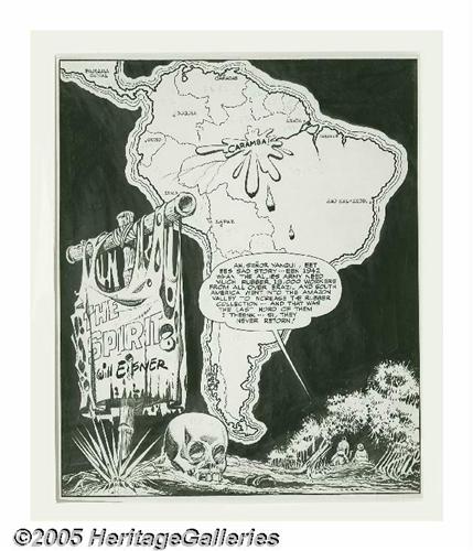 <B>Will Eisner - Spirit Splash Page 1 Original Art, dated 11-10-46 (Des Moines Register and Tribune Syndicate, 1946).</B></I> The late Will Eisner is celebrated as one of the comic book field's most important artists. From the dawn of comic books in the thirties until his life's end in 2005, Eisner never rested on his laurels, and kept working to further his art. Small wonder that the comics field named an annual awards ceremony after the cartooning titan. <B>The Spirit</B></I> was a unique hybrid, both a syndicated strip and a comic book! Eisner often filled the splash pages of his feature with radical title logo treatments -- each was a unique masterpiece of design. He once noted that his approach to the logos had been influenced by George Herriman's <I>Krazy Kat</B></I> with its playful backgrounds. This stunning montage sets the scene for an Spirit adventure in South America, and the overlapping map, <B>Spirit</B></I> logo-marker, symbolic skull, and background figures open the yarn in a way typical of Eisner. Will Eisner taught the techniques he had developed in masterworks such as this in his seminal textbook, <B>Graphic Storytelling</B></I>. The image area of the page is 13" x 16", and the condition of the art is Excellent.
