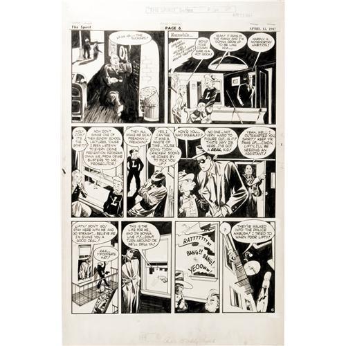 <B>Will Eisner - The Spirit Section, "Escape," page 6 Original Art, dated 4-13-47 (Des Moines Register and Tribune Syndicate, 1947). </B></I> Poor misguided youth -- larcenous Lifty takes the fall for Cracker Barrel in this moody yarn and the Spirit is featured in six of the panels from page 6 of "Escape." The <I>Spirit Section </B></I>was a unique hybrid, both a syndicated strip and a comic book and no great collection of original comic book art could be considered complete without a Will Eisner piece. The image area of this page is 13" x 18", and the condition of the art is Excellent. <BR><BR><b>Shipping:</b> Flat Material, Large (<a target="_blank" href="http://www.heritageauctions.com/common/shipping.php">view shipping information</a>)