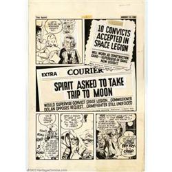 Will Eisner and Wally Wood - Spirit Section page (8/17/52). This is a historic collaboration between these two giants. Rarely seen for public sale, these examples come from the later part of The Spirit's history, when Wally Wood was assisting Will Eisner. Wood's influence was quickly felt, as the strip took a more science-fiction bent. Probably pencilled and laid out by Eisner and finished by Wood, this page, which measures 22" x 15", features Commissioner and Ellen Dolan, and is in very good condition, showing some glue stains, a small amount of white-out, and a stat missing in the second panel.  Important notice: We expect to be auctioning lots at the rate of 200-250 per hour. Sometimes eBay Premier live bid software cannot keep up with that pace, so we strongly recommend that you place a realistic proxy bid now as insurance to avoid disappointment. Also please note that all Heritage/CAA lots purchased through eBay Premier carry a 20% Buyer's Premium.
