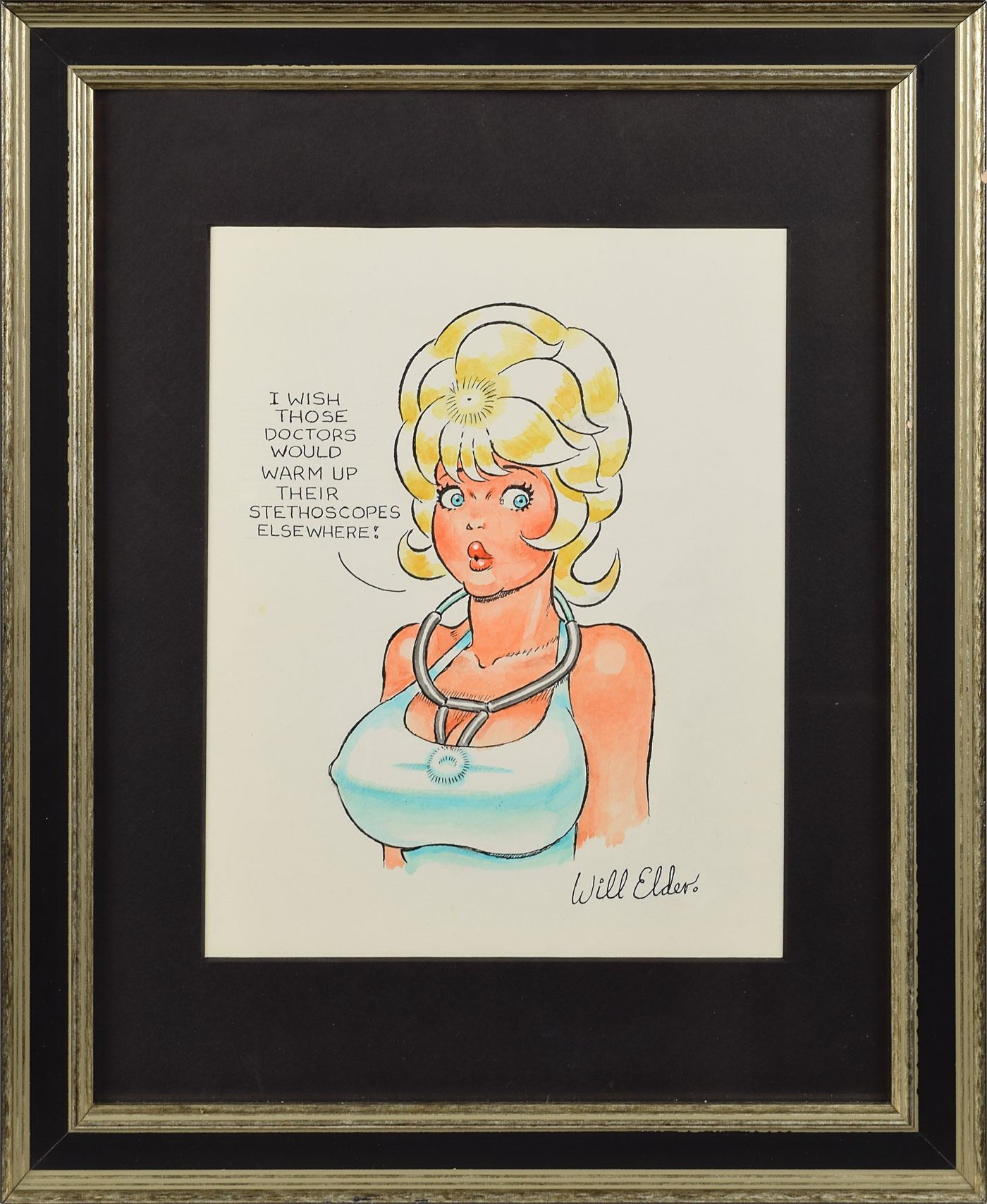 Superb original Annie Fanny sketch accomplished in graphite, ink, and watercolor on a white 7.75 x 9.75 sheet, depicting the buxom blonde wearing a stethoscope and pronouncing: "I wish those doctors would warm up their stethoscopes elsewhere!" Signed in the lower right in black ink by Elder. Matted and framed to an overall size of 13 x 16. In fine condition.