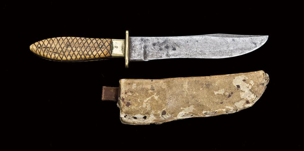Will & Finck Bowie knife. 12 1/8” overall with 7 1/8” clip point blade, with sharpened false edge. The ricasso is marked with the Will & Finck trade mark, double circle above the words “Will & Finck”, “F. S. CAL”. Heavy blade stock is 3/16” thick. Hilt a swell center aged walrus ivory, hand checkered with three brass pins. Crossguard and ferrule are cast brass. Tang tapers significantly from the ricasso to the pommel. The checkering to the walrus ivory was probably done by the owner. The blade has excessive sharpening and wear from period use with spots of light to significant aging. A ”3” is stamped on the bottom of the tang, which represents a size or pattern number. Desirable untouched patina. This is a rare hunting knife pattern by Will & Finck. Period hand-made sheath is of American Indian styling with a laced deerskin styling. Hugh Hayes Collection. Est: $6,000 - $12,000