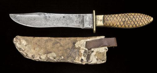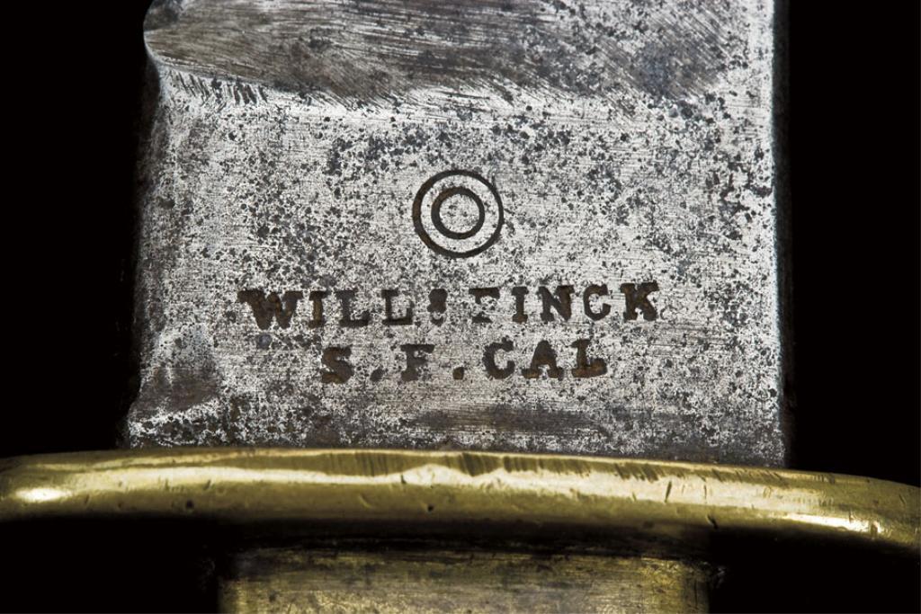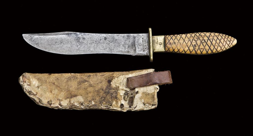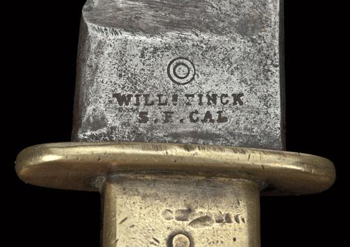 Will & Finck Bowie knife. 12 1/8” overall with 7 1/8” clip point blade, with sharpened false edge. The ricasso is marked with the Will & Finck trade mark, double circle above the words “Will & Finck”, “F. S. CAL”. Heavy blade stock is 3/16” thick. Hilt a swell center aged walrus ivory, hand checkered with three brass pins. Crossguard and ferrule are cast brass. Tang tapers significantly from the ricasso to the pommel. The checkering tothe walrus ivory was probably done by the owner. The blade has excessive sharpening and wear from period use with spots of light to significant aging. A ”3” is stamped on the bottom of the tang, which represents a sizeor pattern number. Desirable untouched patina. This is a rare hunting knife pattern by Will & Finck. Period hand-made sheath is of American Indian styling with a laced deerskin styling. Hugh Hayes Collection. Est: $3,000 - $6,000