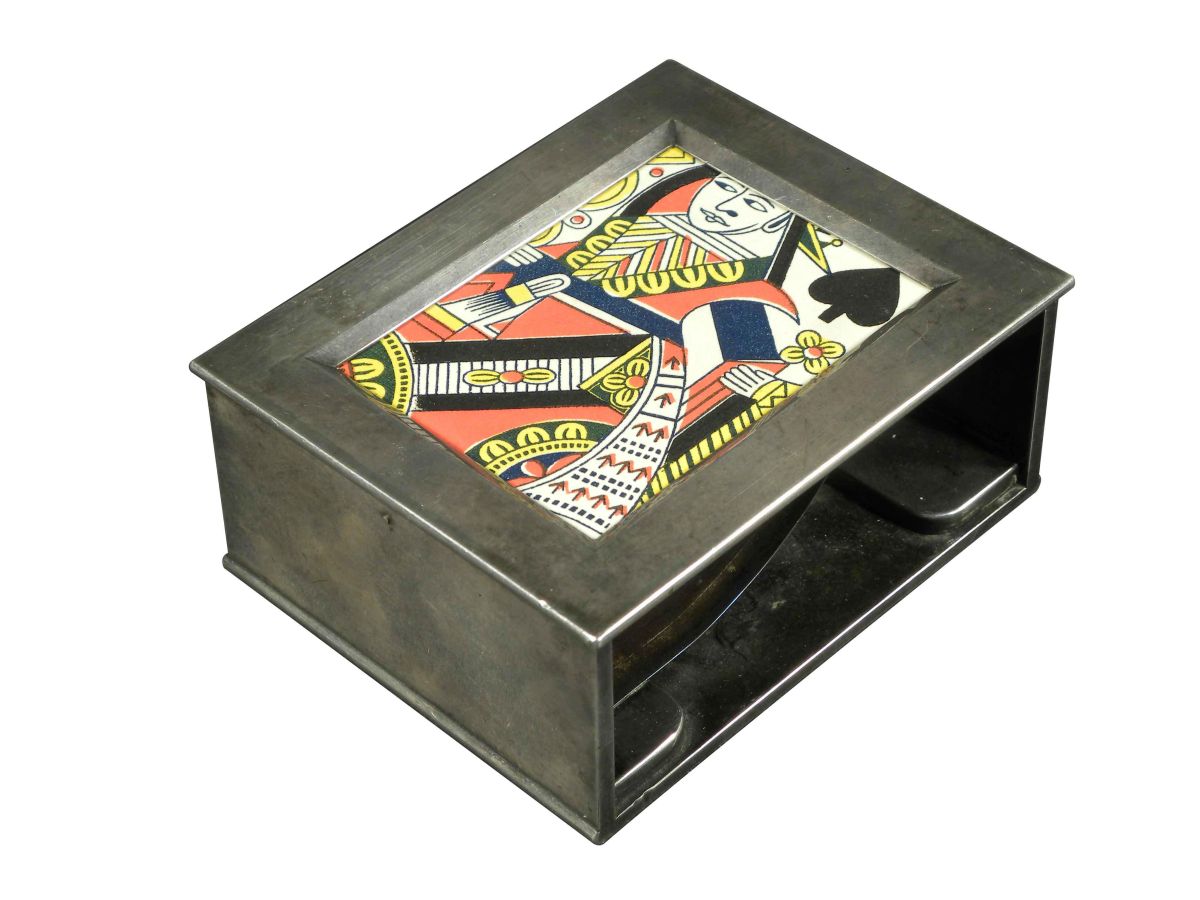 Will & Finck Card Dealers Box #821. Nickel plated, excellent original condition. 3 1/8 X 3 7/8 X 1 5/8 inches.