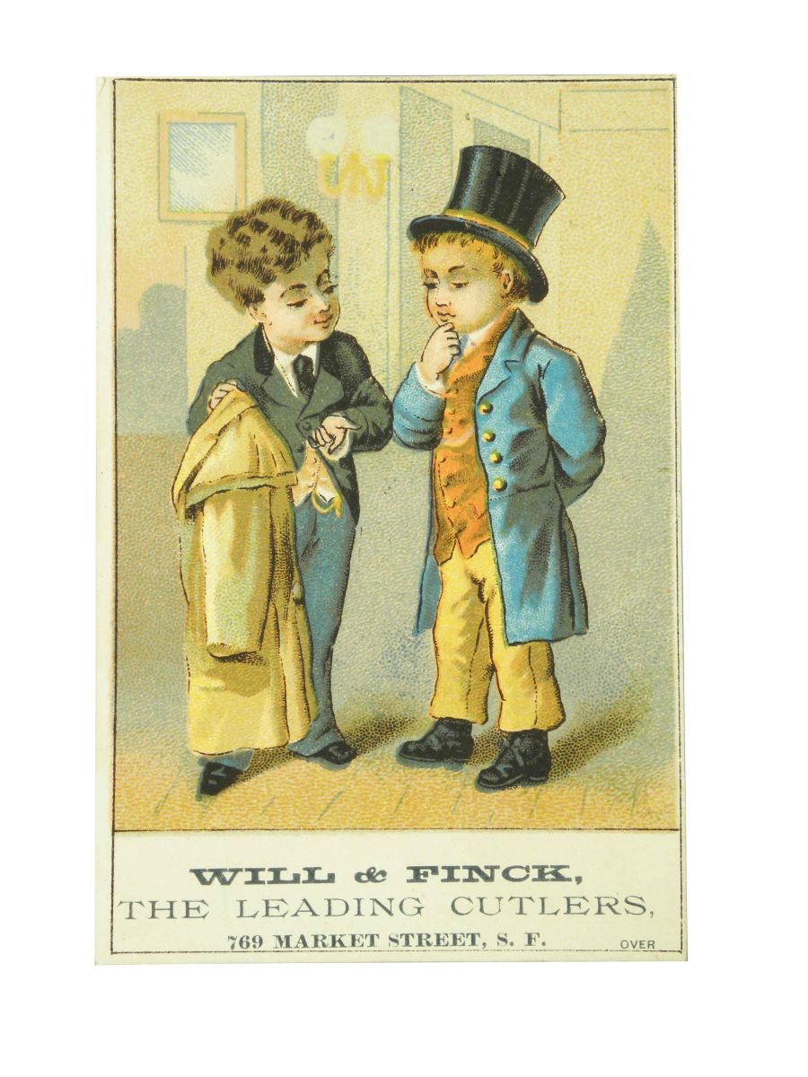 Will & Finck Cutlery Trade Card. Depicting two young lads. San Francisco, CA. Excellent condition. 2 3/4 X 4 1/4 inches.