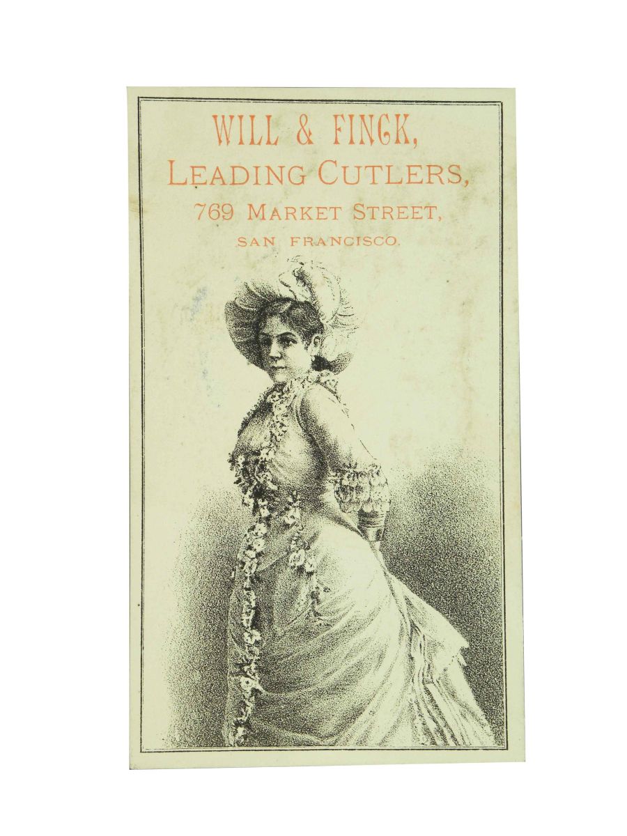 Will & Finck Cutlery Trade Card. Depicting early Victorian Woman. Listing all the products made by Will & Finck Co. San Francisco, CA. Some light stains otherwise good condition. 2 5/8 X 4 1/2 inches.