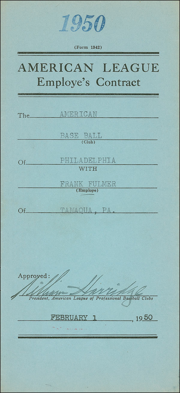DS, two pages on two adjoining sheets, 8.5 x 11, January 26, 1950. American League employee’s contract between the American Base Ball Club of Philadelphia and Frank Fulmer to serve as a scout for a salary of $750. Signed on the exterior panel by Harridge as American League president. In fine condition, with scattered mild toning.