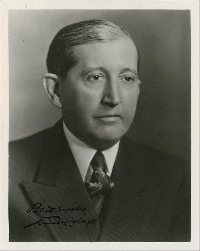 Postmaster general in the Harding administration (1879–1954) who later headed the Motion Picture Producers and Distributors of America, in which capacity he oversaw enforcement of the notorious “Production Code” that imposed strict censorship guidelines on all Hollywood films for decades. Vintage matte-finish 8 x 10 head-and-shoulders portrait, signed in black fountain pen. In very good condition, with horizontal crease passing through his chin and a few other scattered surface flaws. Accompanied by two letters acknowledging receipt of an autograph request and confirming the mailing of a signed photo. Pre-certified PSA/DNA and RRAuction COA.