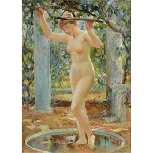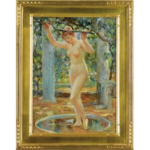 <B>WILL HICKOK LOW (American, 1853-1932)</B></I><BR><I>An Arcadian Nude </B></I><BR>Oil on canvas<BR>14-1/2 x 10-3/4 inches (36.8 x 27.3 cm)<BR>Signed lower right: <I>Will H Low</B></I><BR> <BR>PROVENANCE:<BR>Mary Louise Fairchild MacMonnies Low & Will Hickok Low;<BR>Thence by descent to the present owner.<B>Condition Report:</B> Normal wear commensurate with age.<BR><BR><b>Shipping:</b> Requires 3rd Party Shipping (<a target="_blank" href="http://www.heritageauctions.com/common/shipping.php">view shipping information</a>)
