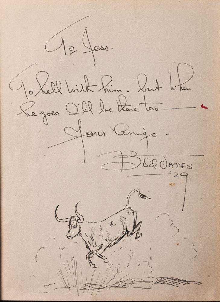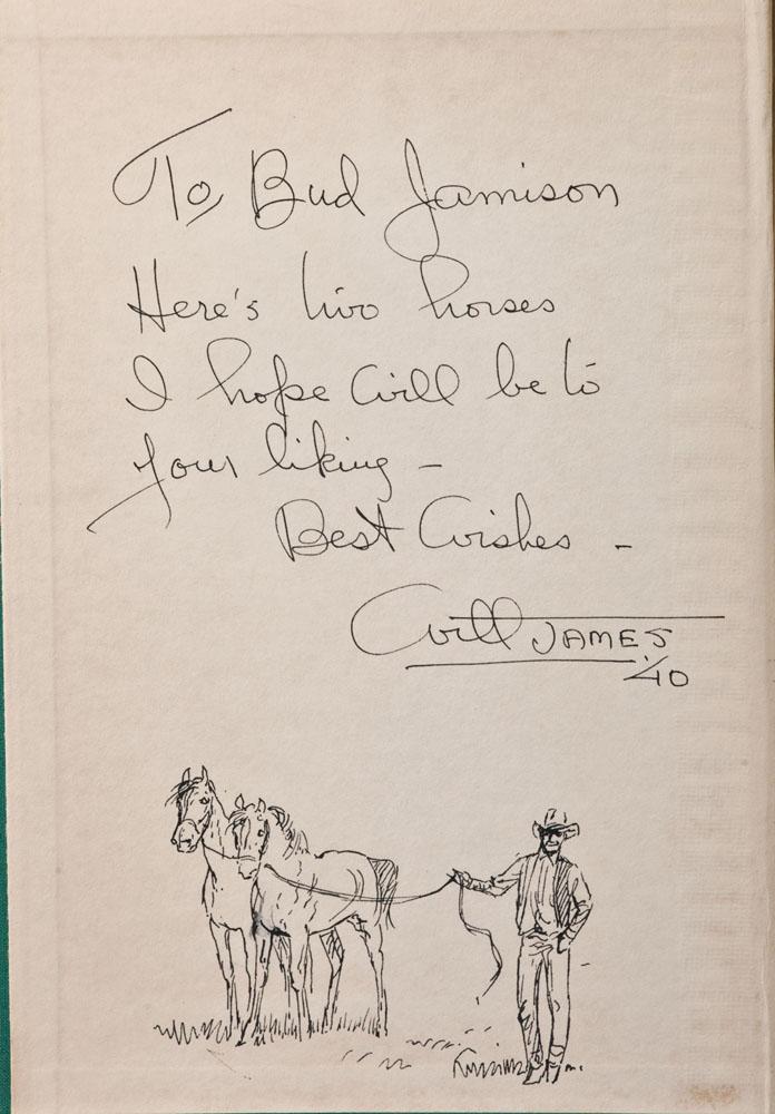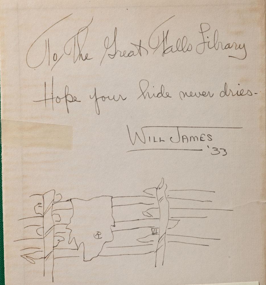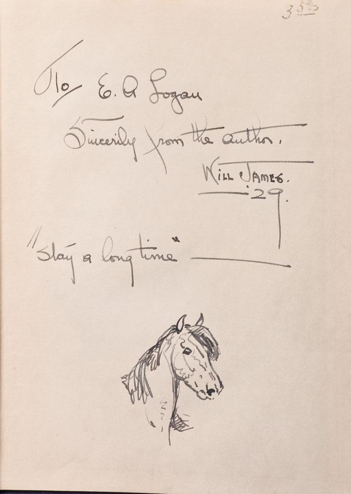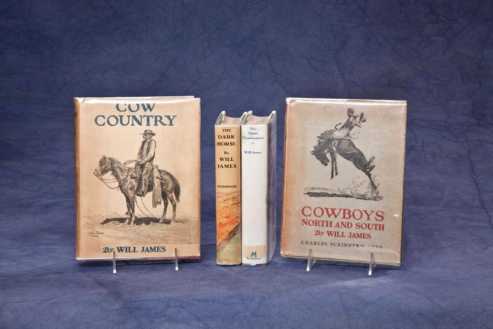 Lot of 4 books all with dust jackets. a) COWBOYS NORTH AND SOUTH. 1929. ORIGINAL DRAWING and INSCRIPTION-SIGNED BILL JAMES ’29 on free front end. Book has slight fade and use wear to spine ends and corners. Dj has some wear to spine end, loss of paper to top of spine and wear to ends and corners, not price clipped; b) COW COUNTRY. 1ST ED. ORIGINAL DRAWING and INSCRIPTION, signed Will James ’29, drawing of horse head and greeting Stay a long time. Has bookplate from Logan’s Books and Curio Store, Cheyenne, Wyoming with buyers name and note on booksellers stationery and signed by E.A. Logan. Book has use wear to spine ends and edges. Old newspaper laid in between two pages and this is yellowed. Dj has use soil and some slight use wear, not price clipped; c) THE DARK HORSE. 1939. 1st ED. ORIGINAL DRAWING and inscription on inside front cover. To Bud Jamison–Here’s two horses I hope you will like. Drawing of horses held by cowboy and signed Will James ’40. Book has slight wear to spine ends. Dj is very good with very slight wear along edges and corners. Bud Jamison was artistic agent for Will James; d) THE THREE MUSTANGEERS. 1933 1ST ED. ORIGINAL DRAWING and gift inscription to THE GREAT FALLS LIBRARY -Hope your hide never dries–Will James ’3 . Book is EX LIB with old card pocket on free front end. Has some interior library marks. Binding has slight use wear to spine ends and corners, and small white M on spine. Dj has sight wear to edges and bit of paper loss to corners and library sticker on end of spine, is not price clipped.