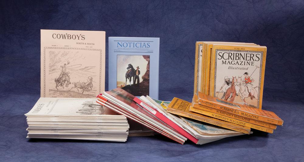 a) COWBOYS NORTH AND SOUTH. THE FIRST FIVE YEARS. Newsletters of the Will James Society. Soft Bound. 1st. Edition. 1993; b) Nevada Magazines. 1966. “James in Nevada.” Color Will James art cover; c) Nevada Magazine. 1990. “In Search of Will James.” Ills. Color photo of James on cover; d) Nevada Magazine. 1973. “The Early Drawings of Will” James by Anthony Amaral; e) Noticias. Autumn, 2001. Will James. Published by Santa Barbara Historical Soc. Quarterly magazine. Done for exhibit of works owned by Abe Hayes (4); f) Boy’s Life. Magazine. 1938. Article. “There Never Was a Horse What Couldn’t Be Rode” by Will James-illustrated. Complete mag; g) Club del Ranchero Menu. Cover – T’Hell with the Reins. Also used on cover of RV Membership booklet. Back is by Edward Borein. h) Will James a Young Oldtimer by Leland Peck. From Rider and Driver. Feb. 6, 1926. Ills; i) Madison Square Garden – World Series Rodeo program with daily insert laid in. 4 programs: 1930, 1931, 1936, 1937. Each has Will James art; j) American West, the Land and Its People. Jan. Feb. 1983. Color Will James on cover. Article: “Will James – the Inevitable Cowboy” by William Gardner Bell. Complete Mag. (2) k) Western Horseman. Aug. 1992. Will James color art on cover. Article: “Happy Birthday, Will. Will James-the Montana Years.” Ills. Color and b/w; l) Songs of the Ranch and Range. 1932. “The Cowboy Sings.” Full page and preface by Will James with ills; m) Smithsonian Mag. Feb. 1988. Article: “Will James was a Complex Cowpoke.” Ills. Color and b/w and photos, neat; n) Scribner’s Magazines. March 1923. “Bucking Horses and Bucking Horse Riders” by Will James; April 1923. Article: “A Cowpuncher” Speaks by Will James; Feb. 1924. “Winter Months in a Cow Camp” by Will James; April 1924. “The Makings of a Cow Horse” by Will James; June 1924 “The Longhorns by Will James”; June 1926 “Smoky-A One Man Hors” by Will James; July 1926 “Smoky-A One Man Horse-Gone Bad” by Will James; Sept. 1927 “Two Old Timers” by Will James. Front Cover is by Paul Brown (2); Dec. 1929. “Jake Adams, Sourdough” by Will James; o) Scribner’s Magazine. Hard Bound Book. July-Dec. 1927. “All in the Days Riding-Down the Wash”; “Two Old Timer” by Will James; p) AN ORIGINAL WILL JAMES CHECK. Security Trust and Savings Bank. Billings, Montana. Sept. 8, 1931. Handwritten and signed Will James. Laminated in clear plastic, fine; q) Large collection of Cowboys North & South, the official publication of the Will James Society.