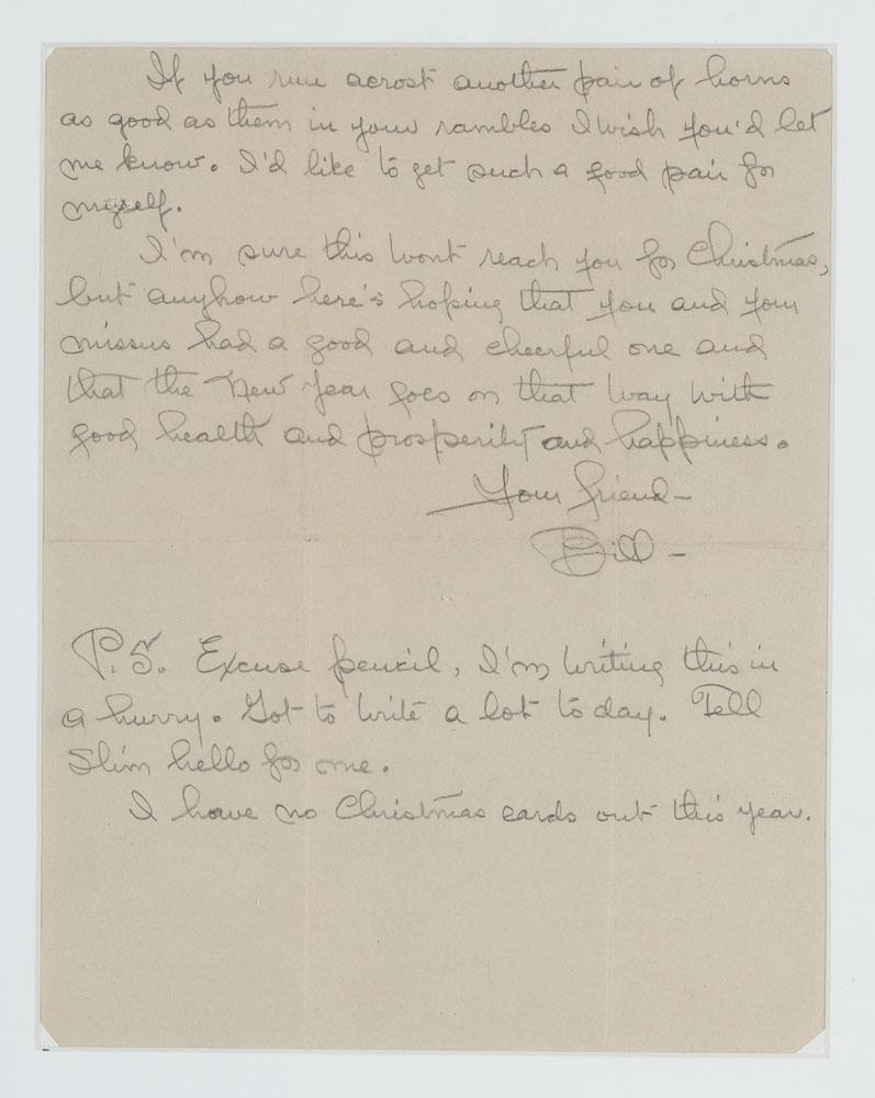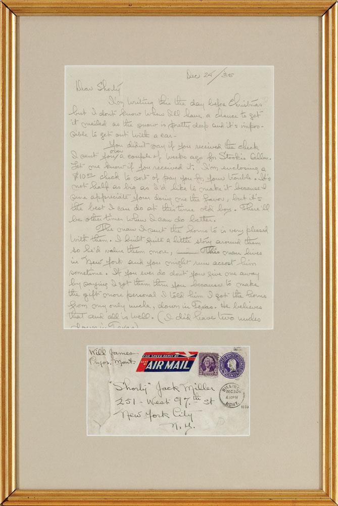To Shorty Jack Miller. 10 1/2” x 8 1/4” letter is pencil on paper, dated Dec. 24/‘35. Great content regarding a set of longhorns James sold with a good story about getting them in Texas (not New York City). Framed to 20” x 13 1/2” with the original envelope from Pryor, Mont. Letter is signed Your friend, Bill. P.S. Excuse pencil, I’m writing this in a hurry.....