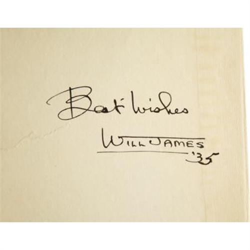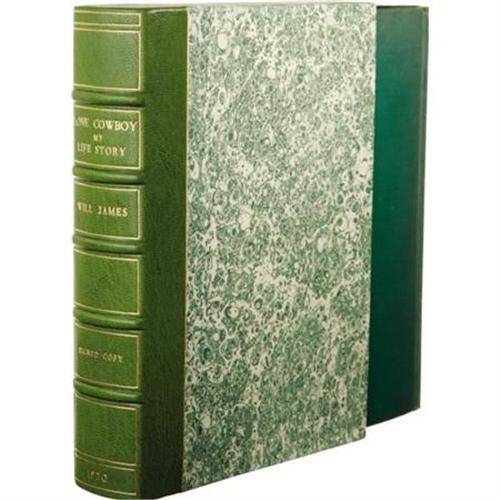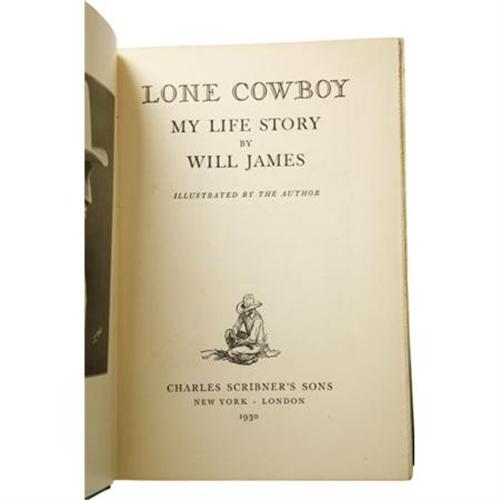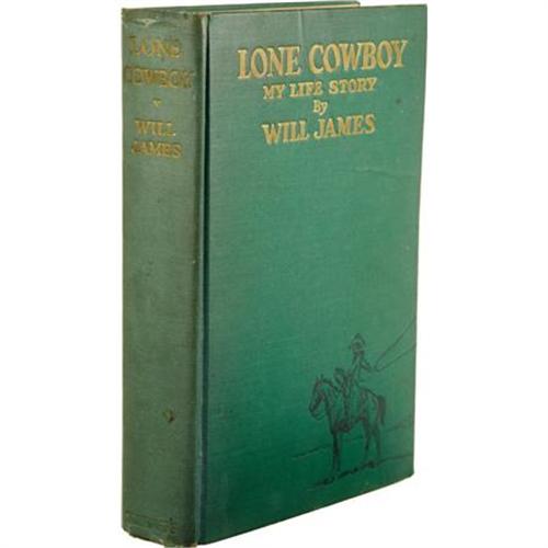 <B>Will James: An Attractive Inscribed Copy of <I>Lone Cowboy: My Life Story.</B></I></B></I> By Will James. Illustrated by the Author. (New York, London: Charles Scribner's Sons, 1930). First edition, inscribed and dated by the author on the front pastedown endpaper. Octavo (8.25” x 5.5”). x, 431 pages. Illustrated with wonderful western drawings by James. Publisher's green cloth, pictorially stamped in black on the front cover, and lettered in gilt on the front cover and spine. Front board slightly creased, spine sunned and a bit faded, otherwise a very good copy. Housed in a quarter morocco book-backed slipcase with the spine in compartments with five raised bands, and tooled in gilt.<BR><BR><b>Shipping:</b> Books & Catalogs (<a target="_blank" href="http://www.heritageauctions.com/common/shipping.php">view shipping information</a>)