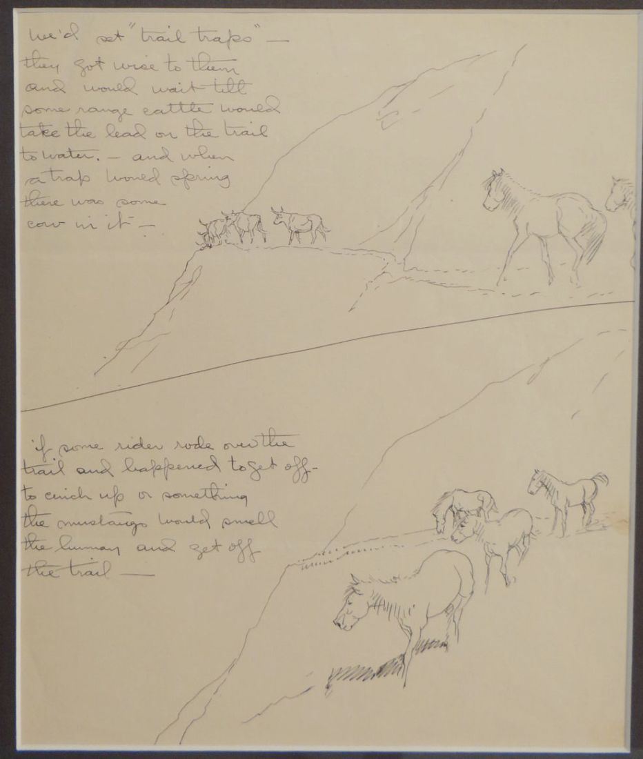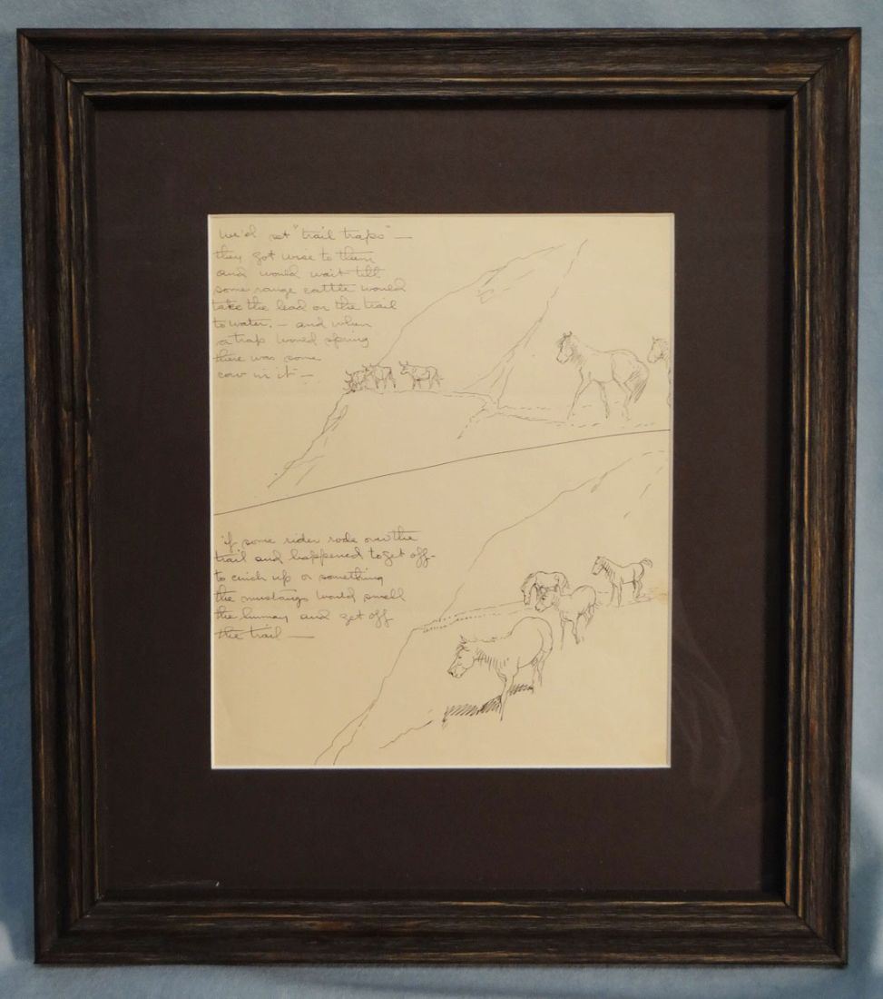 Will James, Mustangs, pen & ink, 9" x 8", framed, inscribed "He'd set "trail traps"- they got wise to them and would wait till some range cattle would take the lead on the trail to water.- and when a trapwould spring there was soe cow in it"- "if some rider rode over the trail and happened to get off- to cinch up or something the mustangs would smell the humanand get off the trail-"