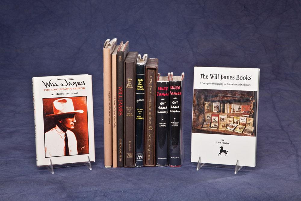 a) Amaral, Anthony. The Gilt Edge Cowboy. 1967, Ills. VG. Dj. From personal collection of Luis Ortega with his bookplate laid affixed. Clippings and review of book laid in; b) Another copy-Ex. Lib. 1st. HB Dj. VG. Has discarded stamped twice on title page; c) Amaral, Anthony. Will James – the Last Cowboy Legend. 1980. VG/VG; d) Bell, William Gardner. Will James – The Life and Works of a Lone Cowboy. 1987. Color and b/w ills. HB in fine dj; e) Bramlett, Jim. Ride for the High Points – the Real Story of Will James. 1987. Deluxe Limited Edition. #232/300 copies. Signed by author. MINT in near mint slip case; f) Bramlett, Jim. Ride for the High Points. Ills. Color and b/w. 1987. 1st. regular edition. SIGNED & INSCRIBED by Author. FINE in VG dj; g) Frazier, Don. The Will James Books. A Descriptive Bibliography for Enthusiasts and Collectors. 1998, Deluxe leather bound edition. Signed by author. #48 of 90. Mint in slip case; h) Frazier, Don. The Will James Books. 1998 1st. Regular Edition. HB dj fine; i) Neill, J.M. Editor. Abe Hays-Guest Curator. Will James: The Spirit of the Cowboy. Deluxe edition. #098 of 100 copies. MINT in MINT DJ; j) Same as above only soft bound. Color and b/w ills. VG.