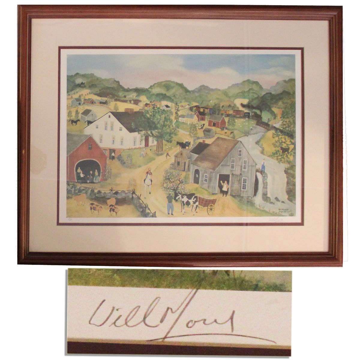 Will Moses framed offset lithograph of ''O'Connells Mill,'' signed and numbered in pencil ''Will Moses / Eagle Bridge / 218/1000'' Painted in the folk art style of his famous great-grandmother Grandma Moses, this New England scene is typical of Moses' depictions of the quiet life of an American village of yesteryear. The 16'' x 23.75'' print is framed to an overall size of 24.75'' x 32.5''. Fine condition.