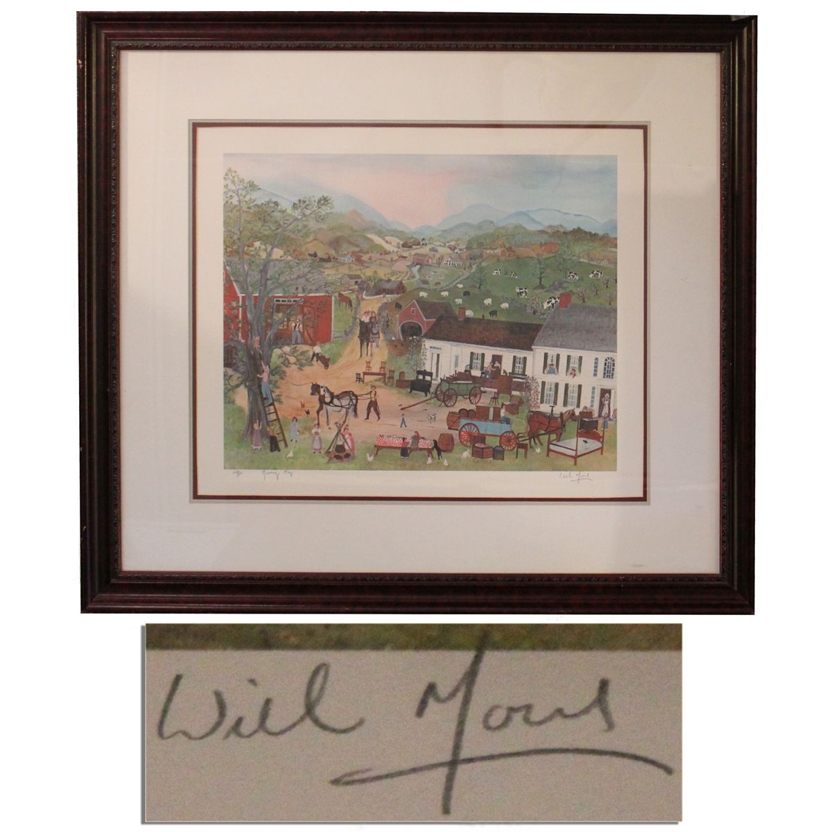 Will Moses framed lithograph of ''Moving Day,'' signed and numbered in pencil ''Will Moses / 262/500 / Moving Day''. Moses paints in the folk art style of his famous great-grandmother Grandma Moses and this New England scene is typical of his depictions of American village life. The 23.75'' x 16'' print is framed to an overall size of 32.5'' x 24.75''. Fine condition.