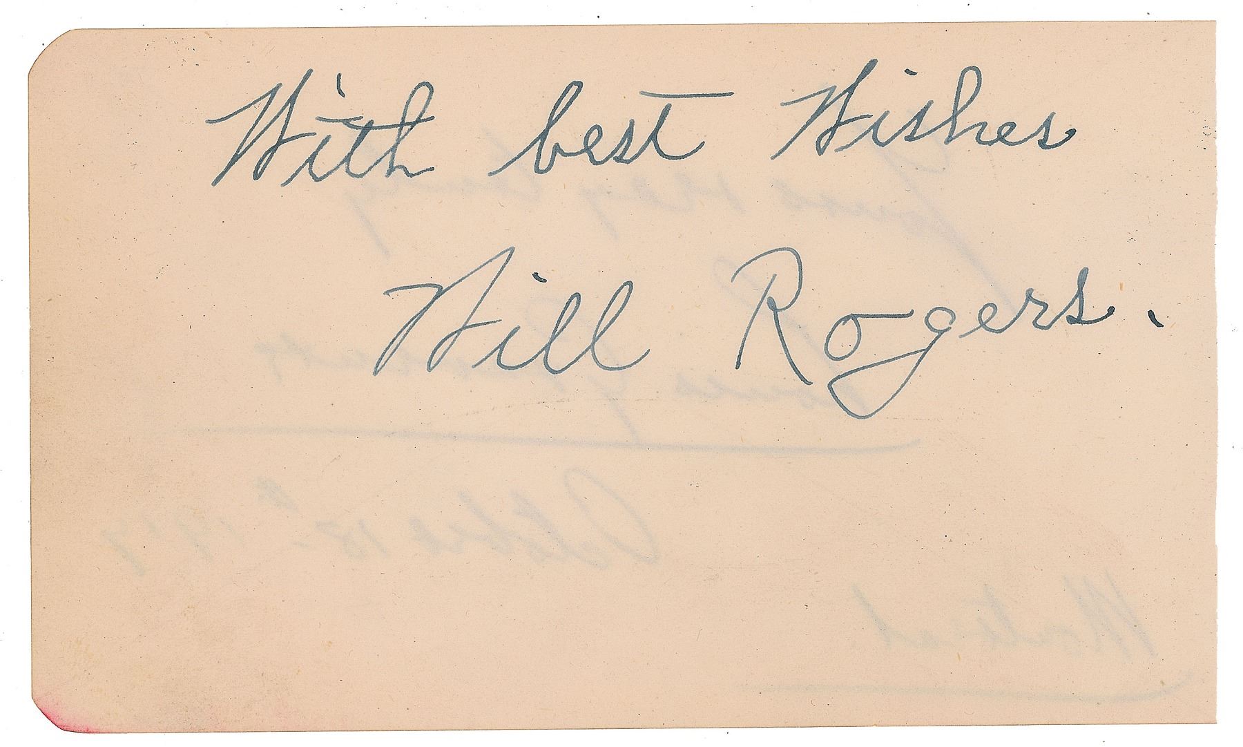Vintage fountain pen signature, "With best wishes, Will Rogers,” on an off-white 6 x 3.5 album page. In fine condition, with light show-through from an unrelated signature on the back.