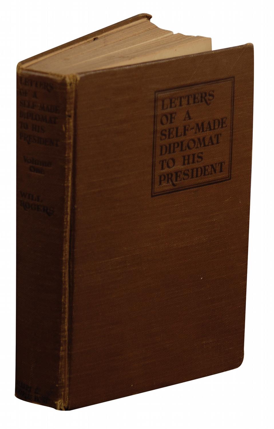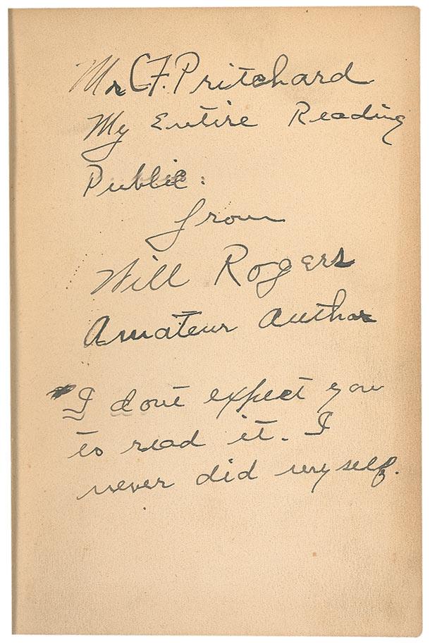 Signed book: Letters of a Self-Made Diplomat to His President—Volume One. First edition. NY: Albert & Charles Boni, 1926. Hardcover, 5.25 x 7.75, 203 pages. Signed and inscribed on the first free end page, “Mr. C. F. Pritchard, My Entire Reading Public, from Will Rogers, Amateur Author. I don’t expect you to read it. I never did myself.” In very good condition, with mild toning, soiling, the front board slightly loose, and rust stains to the last page from a ticket stub attached at the back, with handling wear to the covers. As expected, a brilliantly witty inscription!