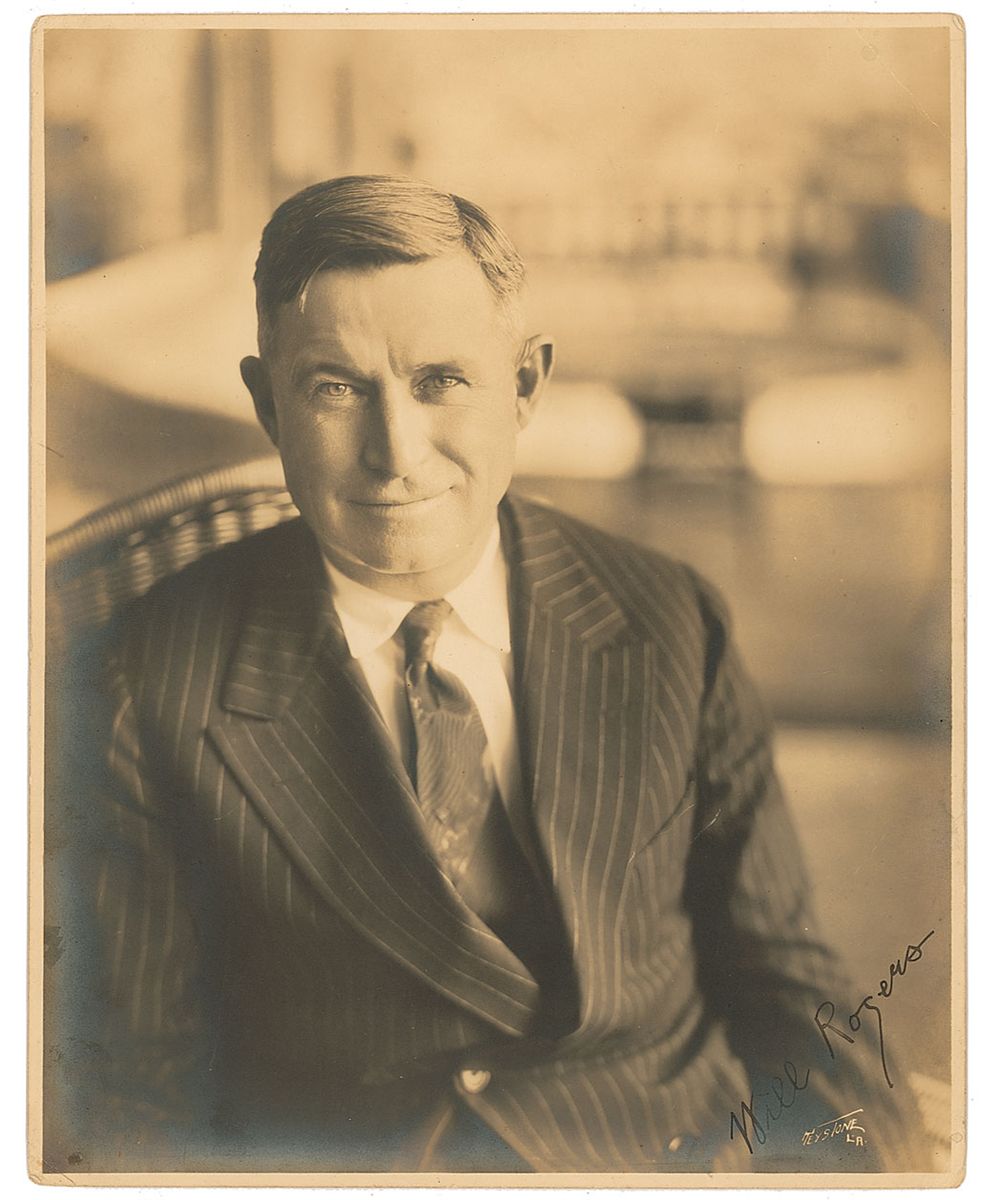 Dashing vintage matte-finish 7.5 x 9.5 portrait of Rogers in a suit and tie, signed in the lower right in fountain pen. Some slightly light contrast to signature, crease to upper right corner, and silvering to borders, otherwise fine condition.