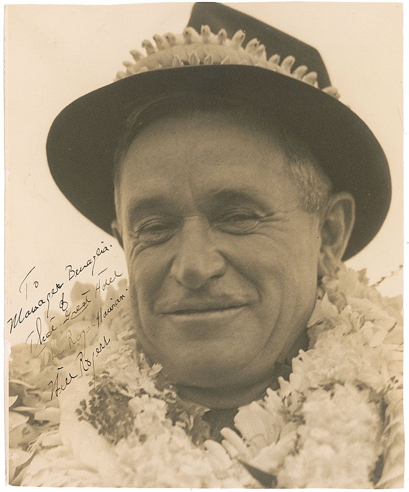 Vintage matte-finish 7.5 x 9 close-up photo of Rogers adorned in Hawaiian leis, signed and inscribed in fountain pen, “To Manager Beraglia of the great hotel, The Royal Hawaiian, Will Rogers.” In fine condition, with slightly trimmed edges.
