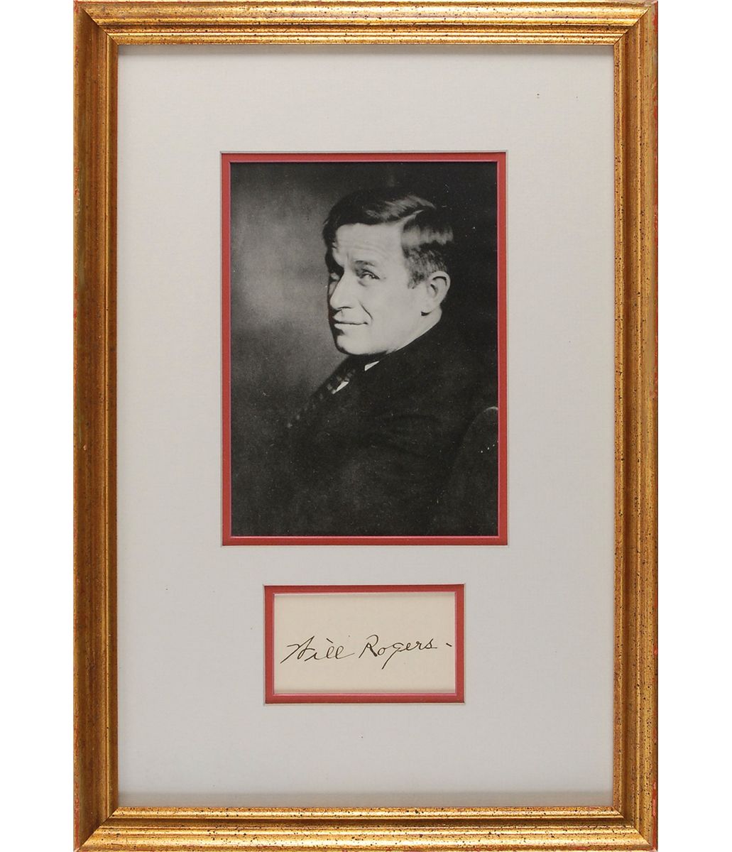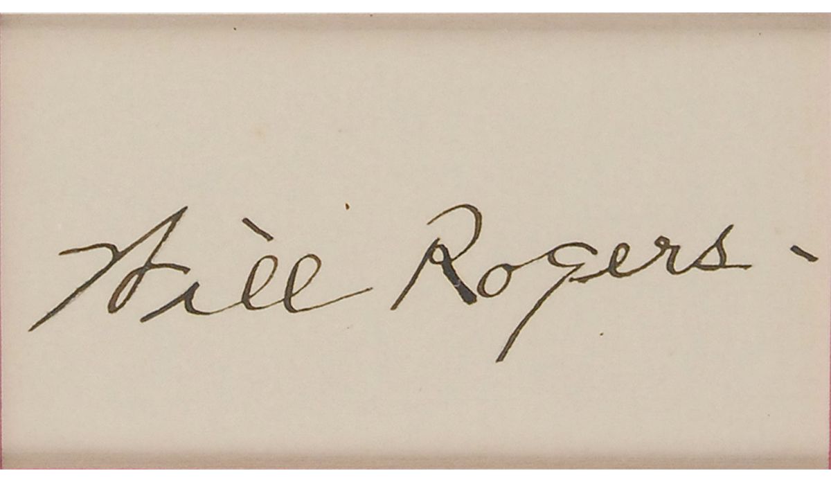 Bold fountain pen signature, “Will Rogers,” on an off-white 3.25 x 1.75 card. Handsomely double-matted and framed with a portrait to an overall size of 12 x 15. In very fine condition.