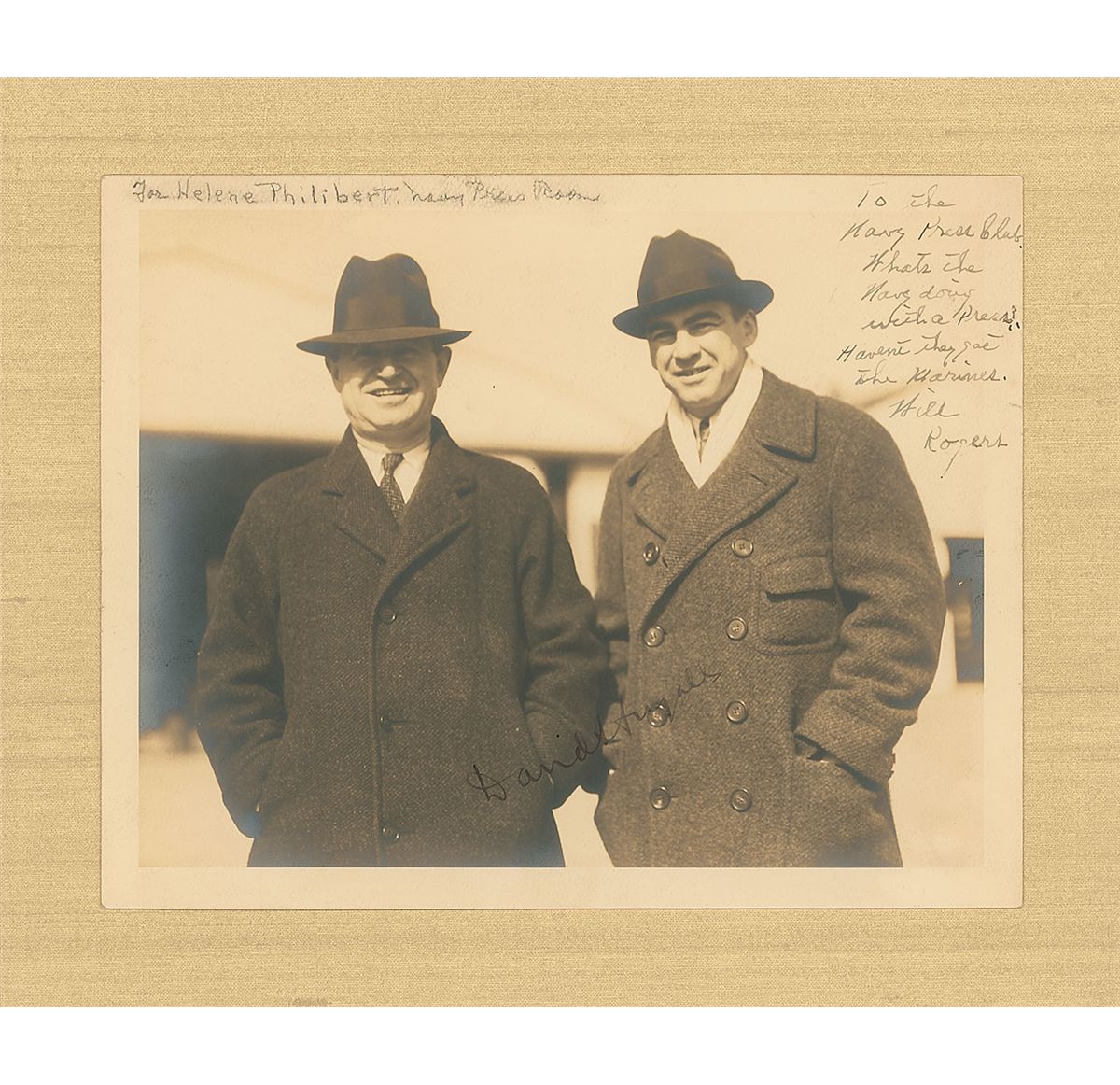Vintage matte-finish 9.75 x 7.75 photo of Rogers with another gentleman, humorously signed and inscribed in fountain pen, “To the Navy Press Club. What’s the Navy doing with a press? Haven’t they got the marines. Will Rogers.” A pencil inscription written at the top in another hand reads, “For Helene Philibert, Navy Press Room.” Affixed at the top to a larger modern mount. In fine condition, with trivial skipping to a few letters of the inscription and signature. Philibert assisted in handling the Navy’s press relations beginning in 1918, working there through the 1930s.