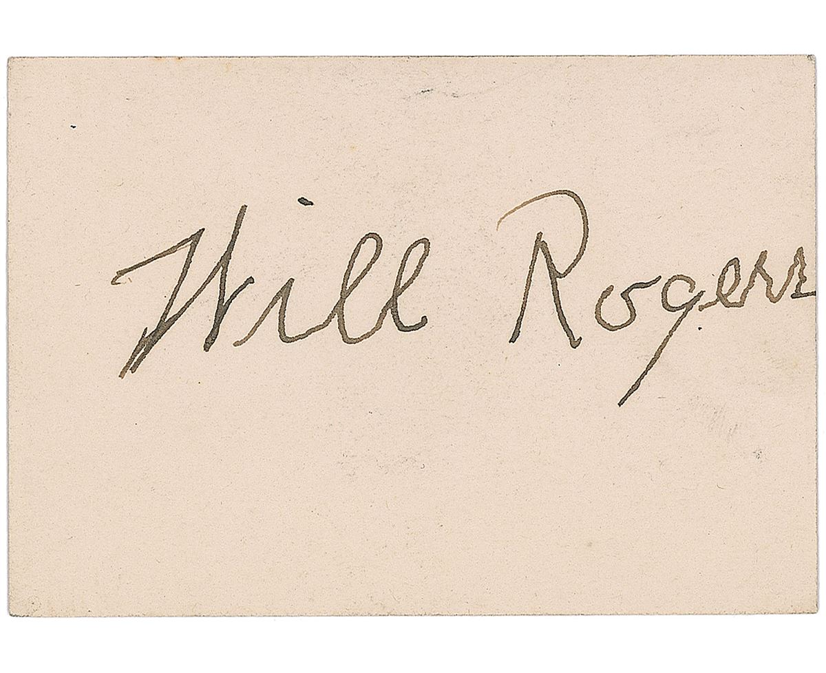 Ink signature, “Will Rogers,” on the reverse of an off-white 2.75 x 2 calling card of a “Miss Kinkead.” In fine condition. Accompanied by the original transmittal envelope with a collector’s notation dating the signature to Phoenix, Arizona, 1926.