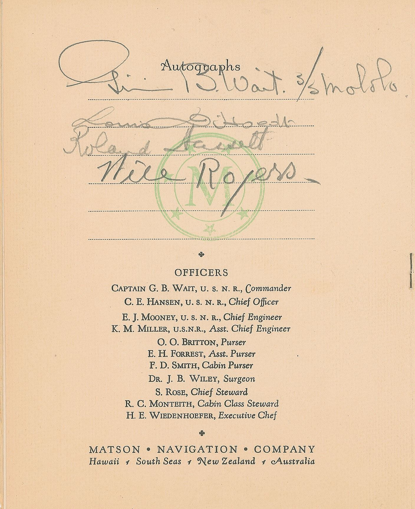 Vintage dinner menu for the SS Malolo cruise ship bound for Honolulu as part of the Matson Navigation Company on July 26, 1934, measures 12 x 7.75 open, signed in the autograph section in pencil by Will Rogers. In fine condition, with light handling wear. Accompanied by a full letter of authenticity from PSA/DNA.