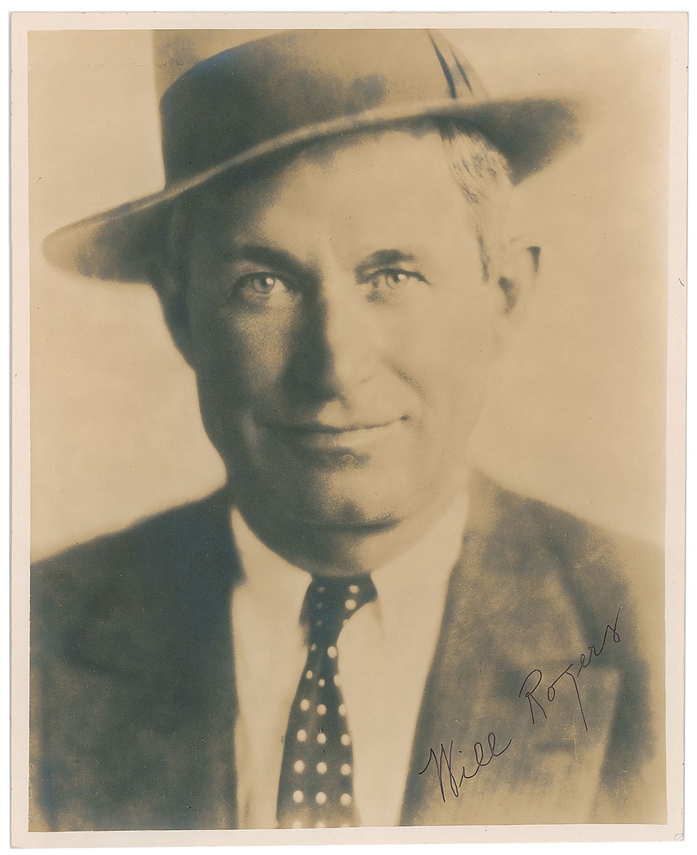 Vintage sepia matte-finish 7.75 x 9.75 close-up photo of the great actor and humorist in a suit and tie, neatly signed in fountain pen. Reverse bears a Keystone Photo Service ink stamp. In fine condition.